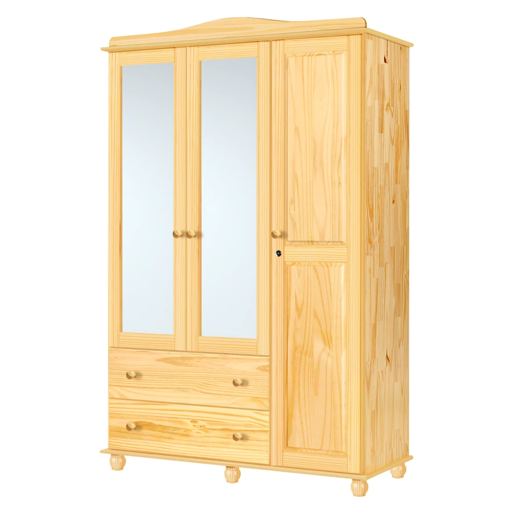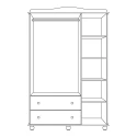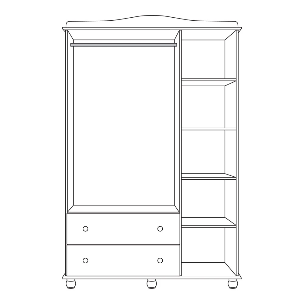 materiál masiv borovice, lakované provedení prostor dělený 2:1, v pravé části 4 police v levé části dveře se zrcadlem, kovová šatní tyč, 2 zásuvky s kovovými pojezdy