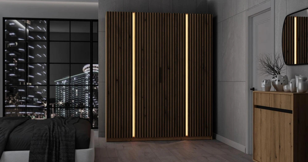 Pro lepší přehlednost a vyšší komfort lze skříň doplnit o LED osvětlení, které usnadní orientaci uvnitř a dodá celku moderní vzhled.