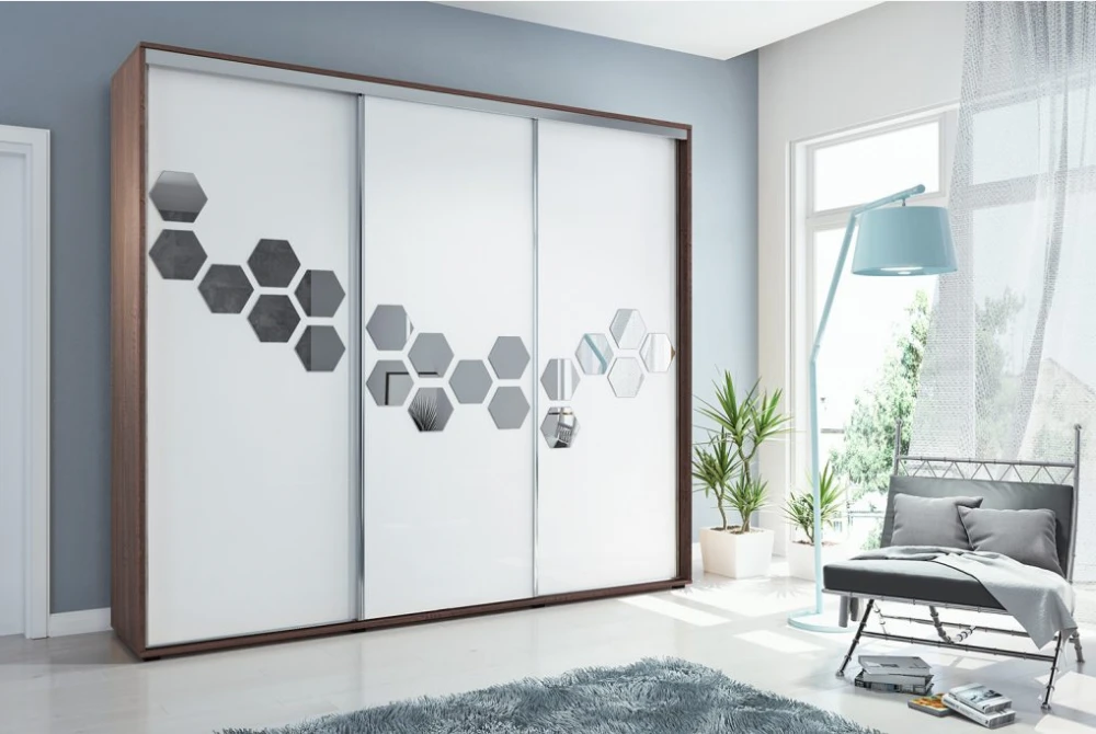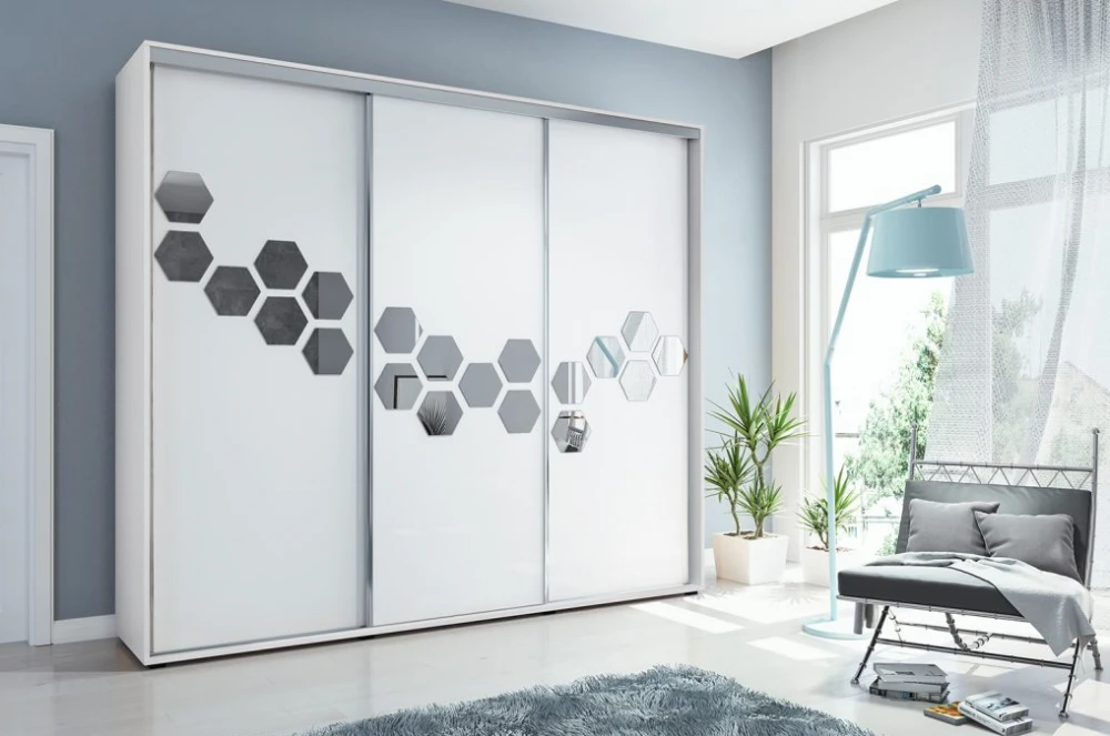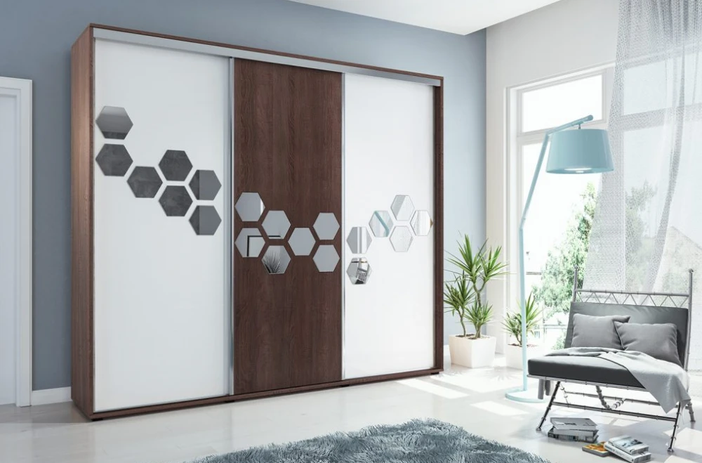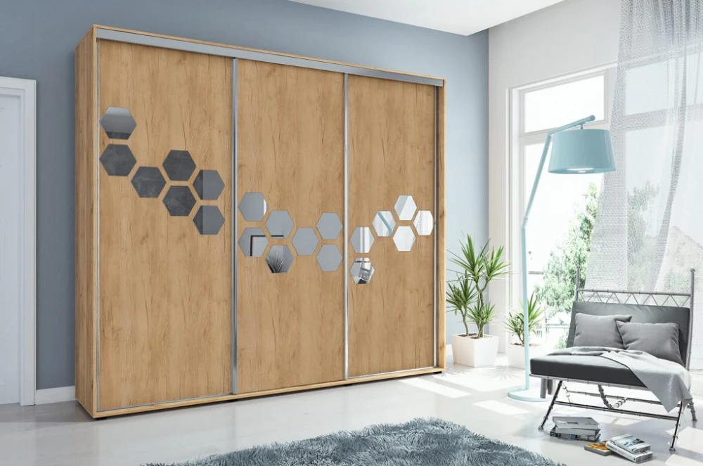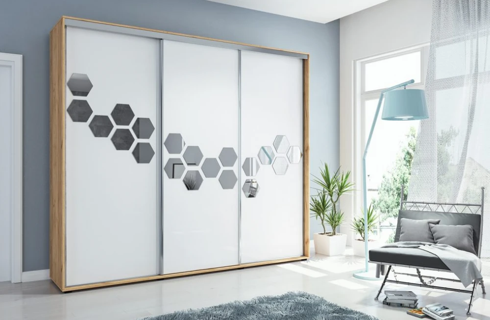 Luxusní šatní skříň v jedinečném designu. Skříň disponuje třemi posuvnými dveřmi, středovou část zdobí elegantní zrcadlový pás. Nábytek je vyrobený z kvalitní laminované desky.