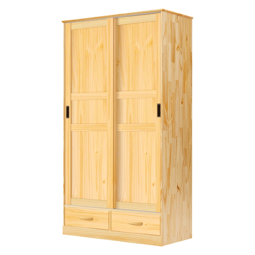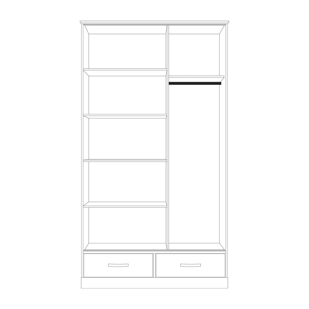 materiál masiv borovice, lakované provedení 2 zásuvky s kovovými pojezdy, 2 posuvné dveře v levé části 4 police, v pravé části 1 police a kovová šatní tyč
