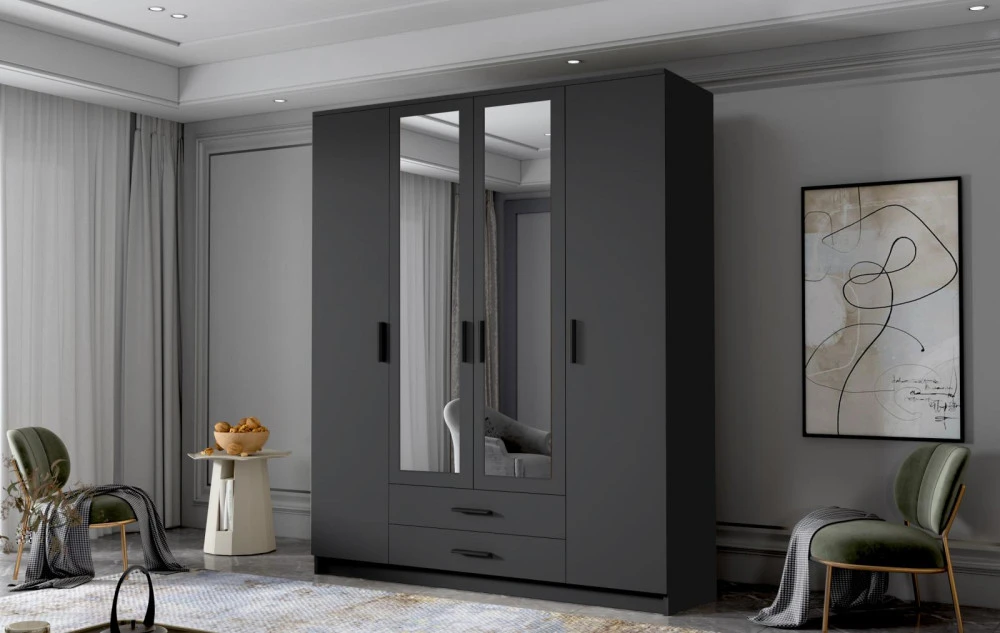 Šatní skříň Arya II v moderním designu má šířku 160 cm a je rozdělena na tři praktické části. Vnitřní uspořádání kombinuje závěsnou tyč, devět polic a 2 šuplíky, což umožňuje přehledné a praktické rozdělení šatníku.