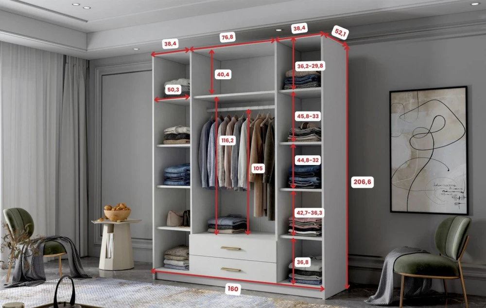 Šatní skříň Arya II v moderním designu má šířku 160 cm a je rozdělena na tři praktické části. Vnitřní uspořádání kombinuje závěsnou tyč, devět polic a 2 šuplíky, což umožňuje přehledné a praktické rozdělení šatníku.
