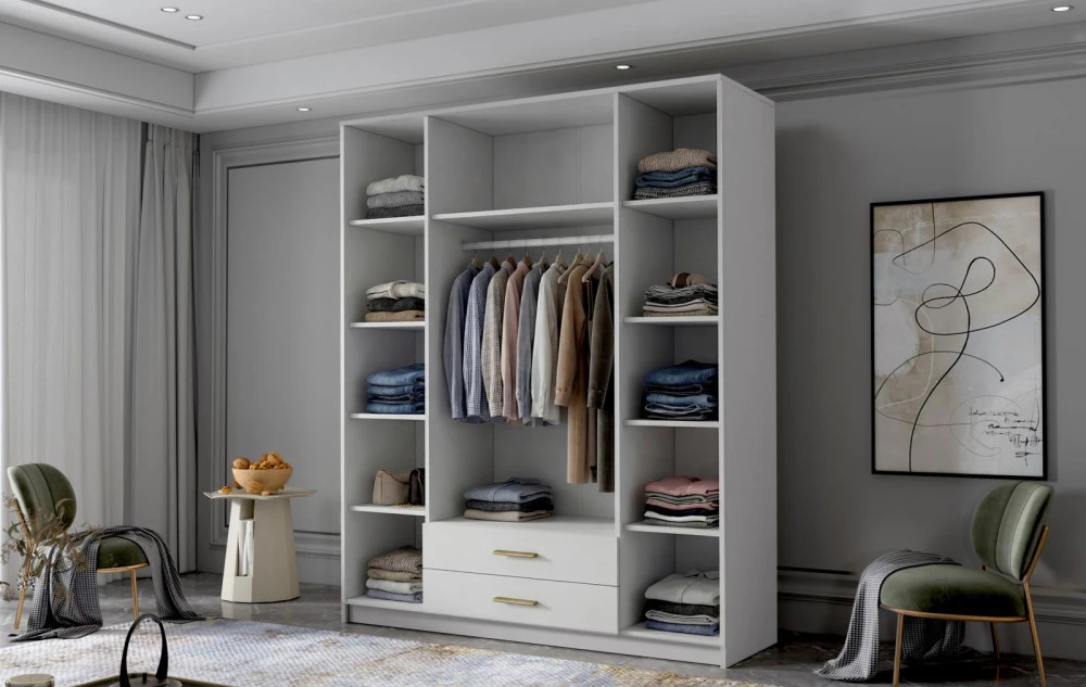 Šatní skříň Arya II v moderním designu má šířku 160 cm a je rozdělena na tři praktické části. Vnitřní uspořádání kombinuje závěsnou tyč, devět polic a 2 šuplíky, což umožňuje přehledné a praktické rozdělení šatníku.