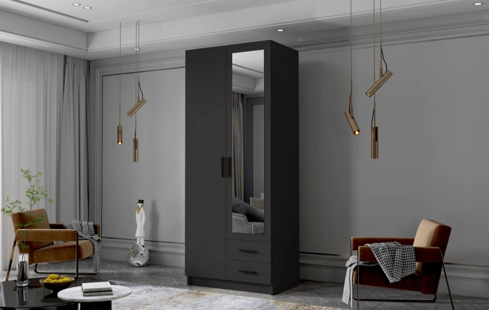 Šatní skříň Arya II v moderním designu má šířku 80 cm a je rozdělena na dvě praktické části. Vnitřní uspořádání kombinuje závěsnou tyč, čtyři police a 2 šuplíky, což umožňuje přehledné a praktické rozdělení šatníku.