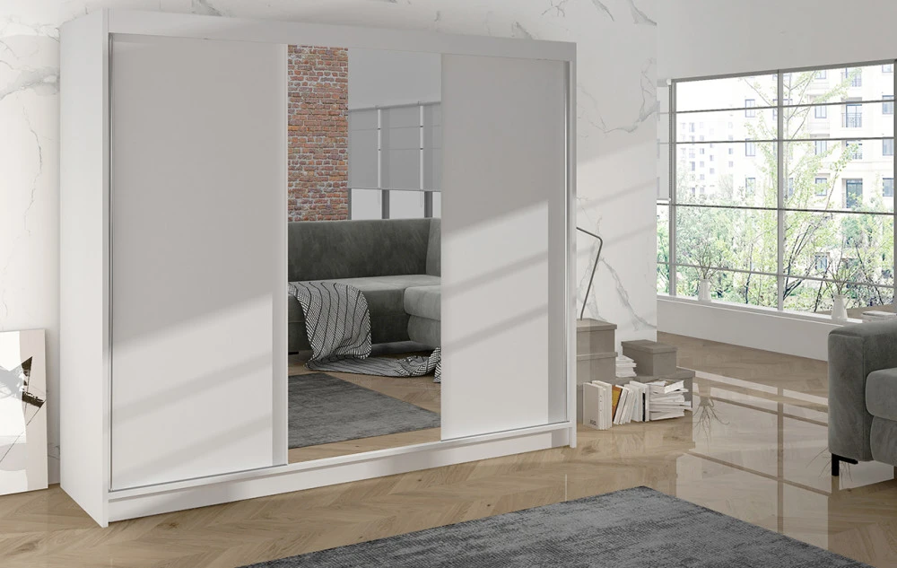 Korpus i dveře jsou vyrobeny z odolné 16 mm laminované desky s ABS hranami, které zajišťují dlouhou životnost. Posuvné dveře se hladce pohybují po hliníkových vodicích lištách. Skříň je dostupná v několika atraktivních barevných provedeních, takže ji snadno sladíte s ostatním nábytkem.