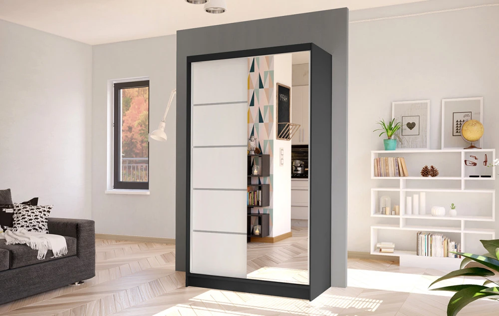 Velkou výhodou jsou posuvné dveře, které šetří místo při otevírání a zároveň zajišťují pohodlný přístup do celého vnitřního prostoru skříně. Vnitřní uspořádání kombinuje závěsnou tyč na ramínka a čtyři praktické police, takže můžete oblečení, doplňky i další věci uložit přehledně a systematicky.
