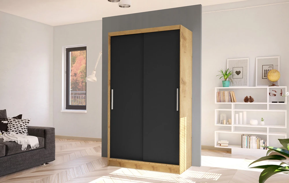 Velkou výhodou této skříně jsou posuvné dveře, které šetří místo při otevírání a zároveň umožňují pohodlný přístup do celého interiéru. Tento systém je ideální zejména do menších místností, kde je důležité maximálně využít dostupný prostor.