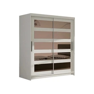 Skříň nabízí dostatek úložného prostoru díky praktickému vnitřnímu uspořádání, které je vyobrazeno na fotografii. Posuvné dveře jsou ideální pro šetření místem a umožňují pohodlný přístup k uloženým věcem.