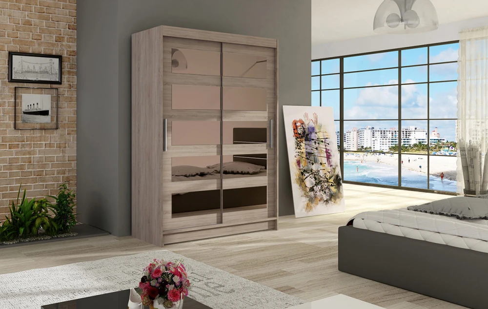 Moderní a elegantní design skříně osloví i náročné zákazníky. Eleganci podtrhují dlouhé stříbrné úchyty a moderní nádech dodávají kouřová zrcadla, která jsou nalepena na dveřích skříně. Je vyrobena z lamina o síle 16 mm a hrany jsou ukončeny ABS lištou. Vodící lišty jsou vyrobeny z odolného hliníku a splňují požadavky pro každodenní užívání. Díky svému uspořádání poskytuje dostatek úložného prostoru. Skvěle se hodí do ložnice, předsíně, dětského, nebo studentského pokoje. Skříň je dodávána v demontu a součástí je montážní plánek včetně všech potřebných spojovacích materiálů. Vyobrazené dekorace nejsou v ceně. Skleněná zrcadla jsou součástí skříně.