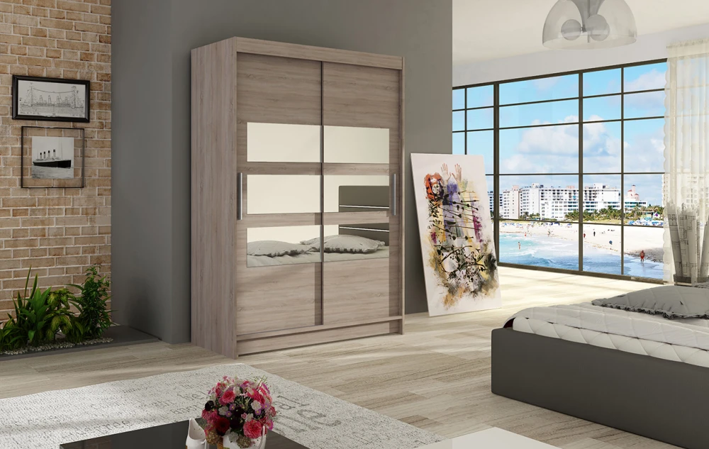 Moderní a elegantní design skříně osloví i náročné zákazníky. Eleganci podtrhují dlouhé stříbrné úchyty a moderní nádech dodávají zrcadla, která jsou nalepena na dveřích skříně. Je vyrobena z lamina o síle 16 mm a hrany jsou ukončeny ABS lištou. Vodící lišty jsou vyrobeny z odolného hliníku a splňují požadavky pro každodenní užívání. Díky svému uspořádání poskytuje dostatek úložného prostoru. Skvěle se hodí do ložnice, předsíně, dětského, nebo studentského pokoje. Skříň je dodávána v demontu a součástí je montážní plánek včetně všech potřebných spojovacích materiálů. Vyobrazené dekorace nejsou v ceně. Skleněná zrcadla jsou součástí skříně.