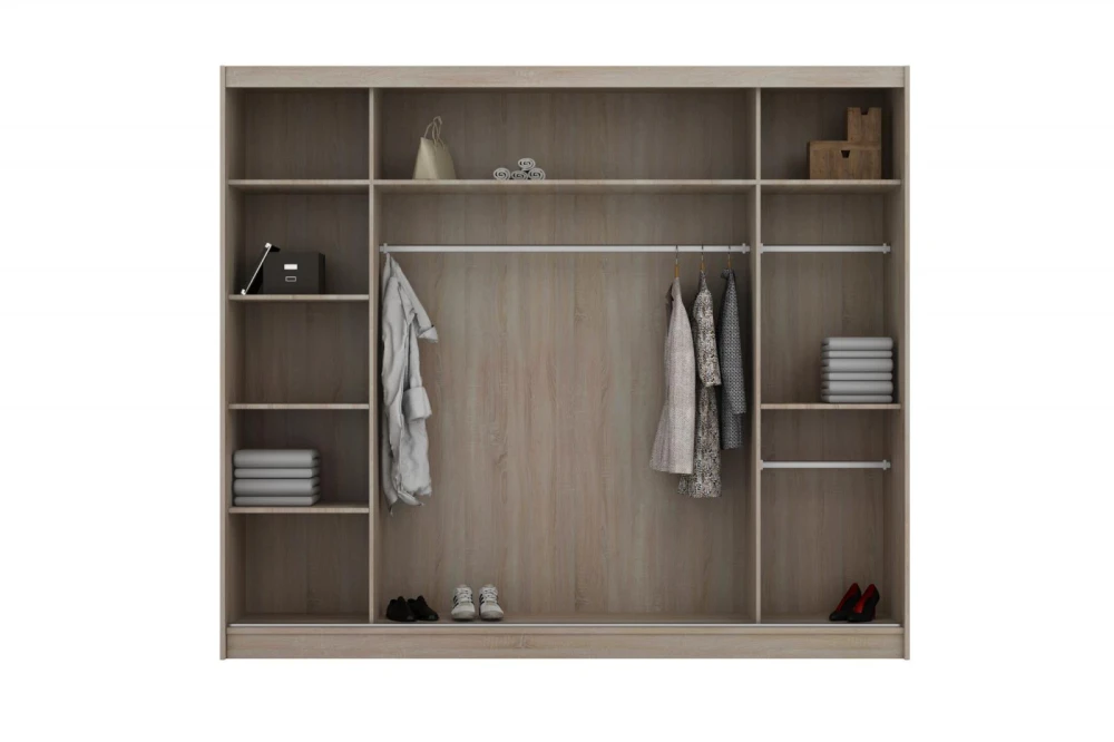 Skříň Nova s posuvnými dveřmi, je vyrobena z kvalitního lamina o síle 16 mm v dekoru dub sonoma. Na prostředních dveřích skříně je nalepené zrcadlo, které místnost opticky zvětší a prosvětlí. Díky svým rozměrům a uspořádání poskytuje dostatek úložného prostoru. Skříň je dodávána v demontu a součástí je montážní plánek včetně všech potřebných spojovacích materiálů. Skříň nabízíme v rozměrech: 120 cm, 150 cm, 200 cm, 250 cm. Všechny dostupné rozměry nabízíme také v dekoru wenge. Vyobrazené doplňky a dekorace nejsou v ceně.
