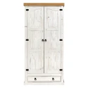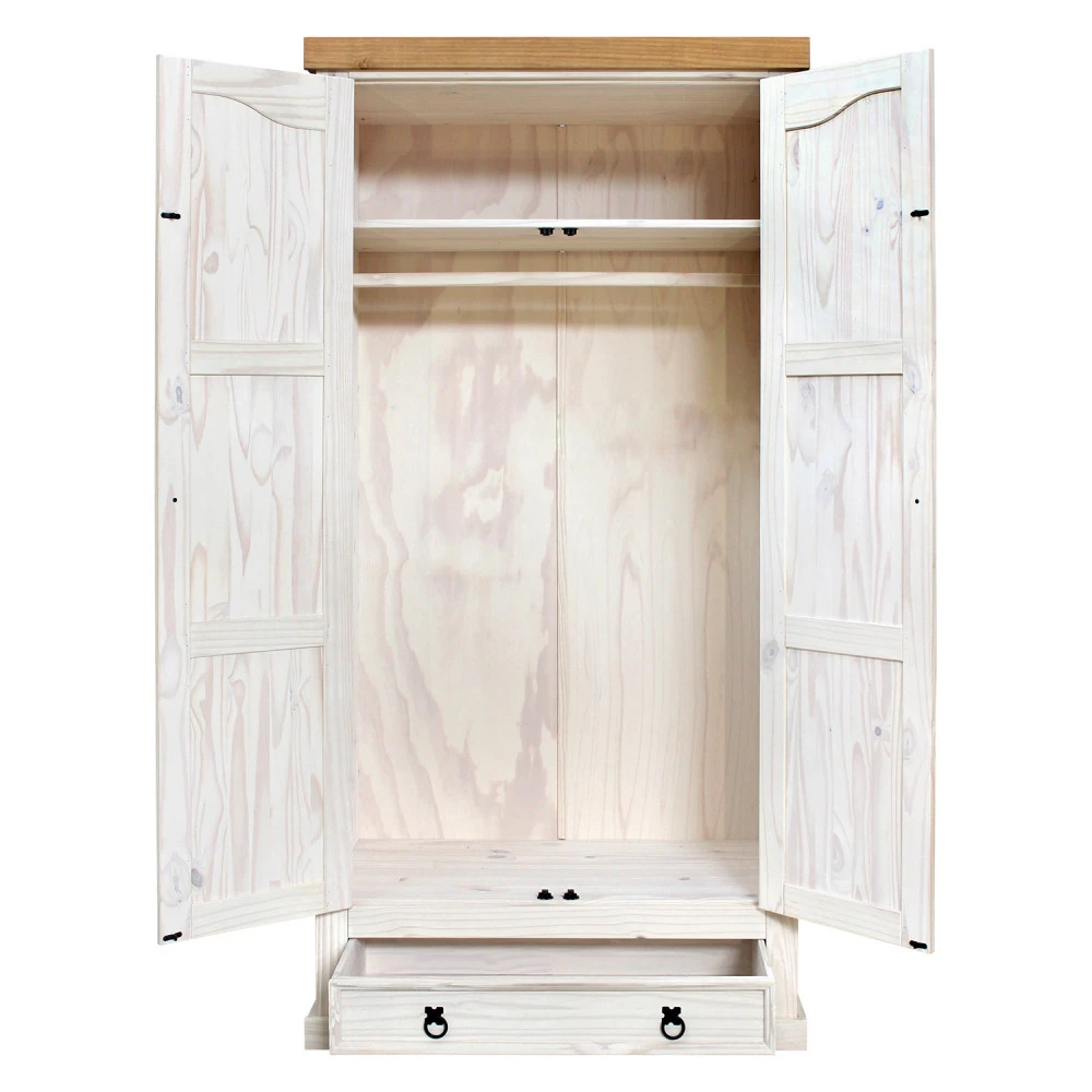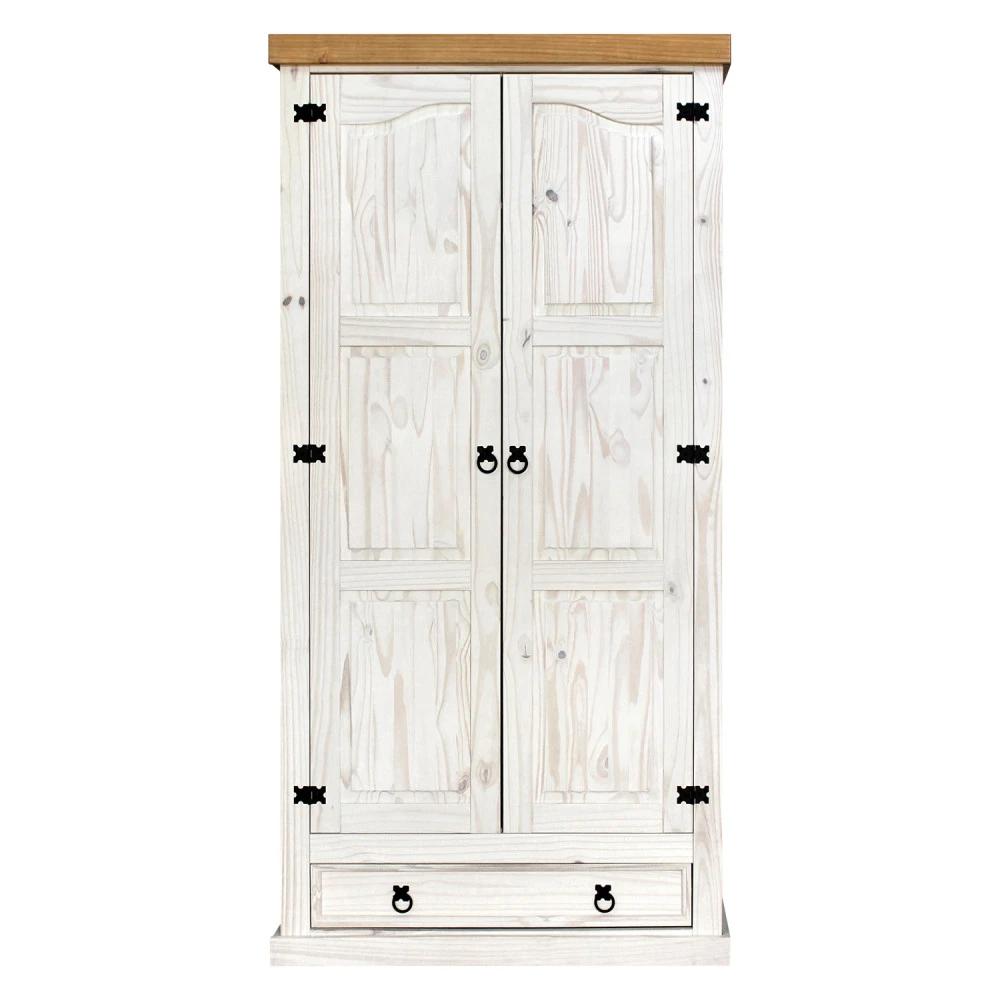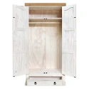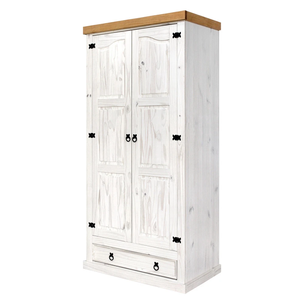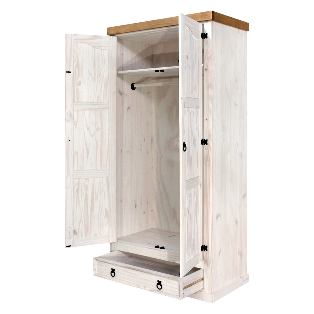 materiál masiv borovice voskovaná v bílém odstínu horní lem masiv borovice voskovaná v medovém odstínu šatní skříň s šatní tyčí a policí na klobouky ve spodní části velká zásuvka, kovové ozdobné úchytky doporučený nástavec 16951B součást sestavy Corona bílá