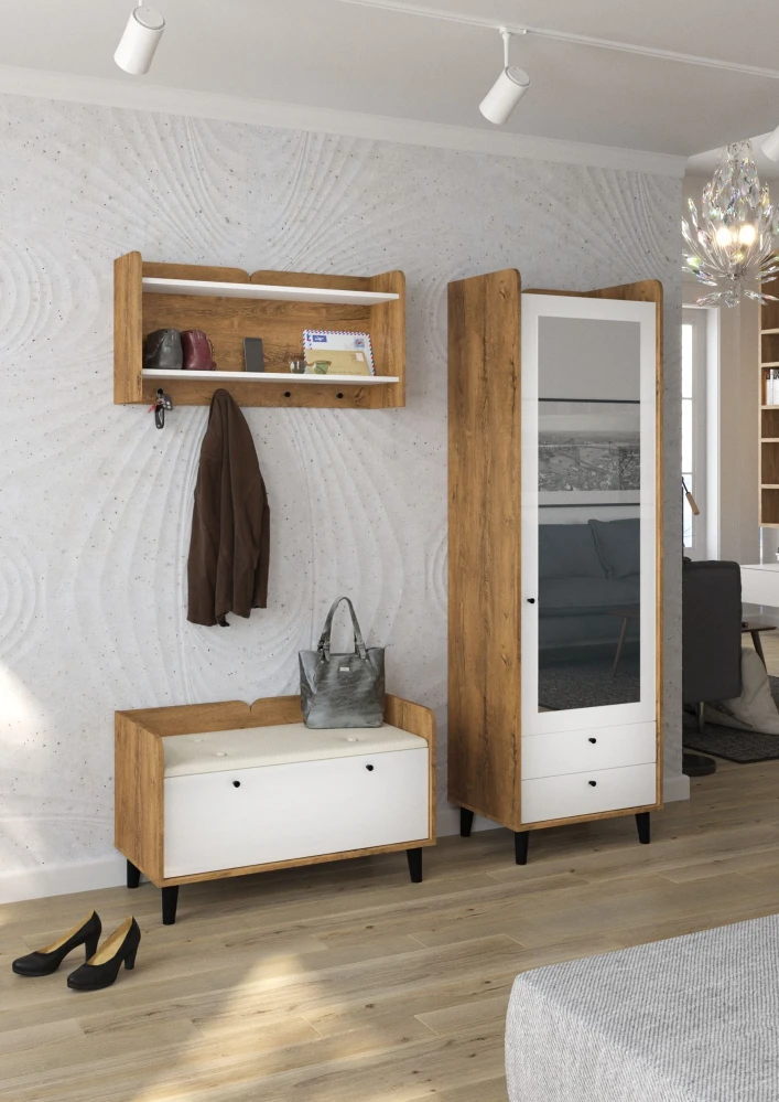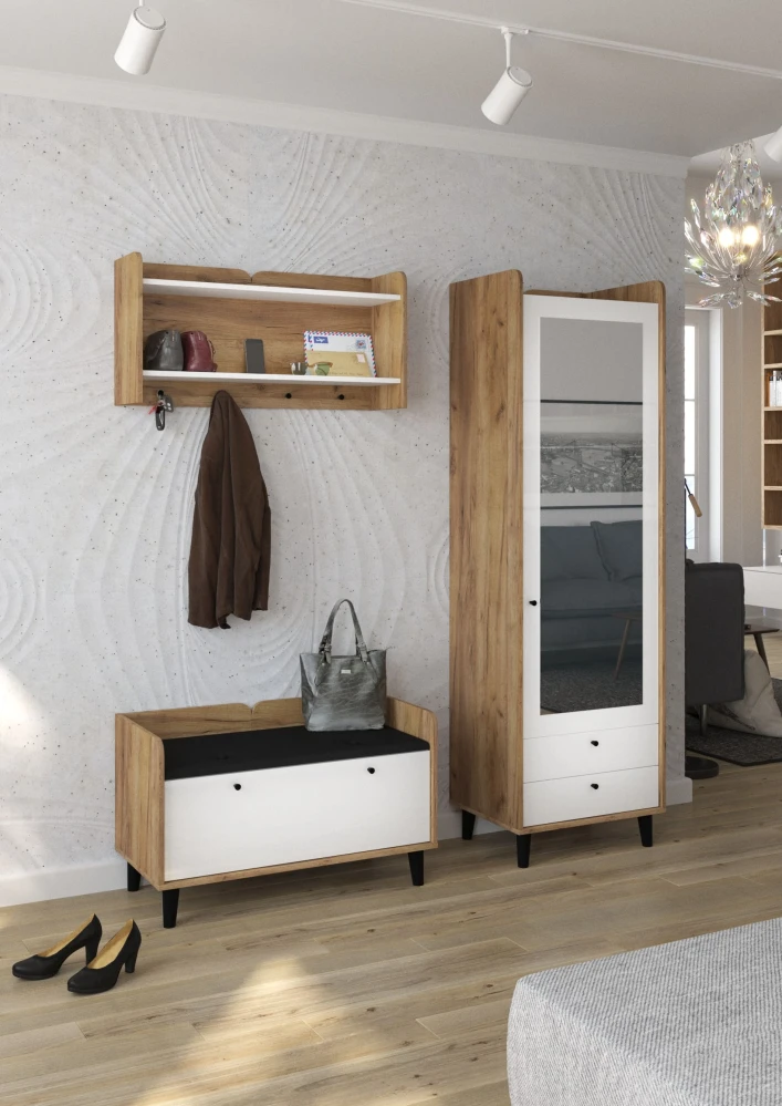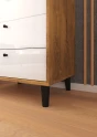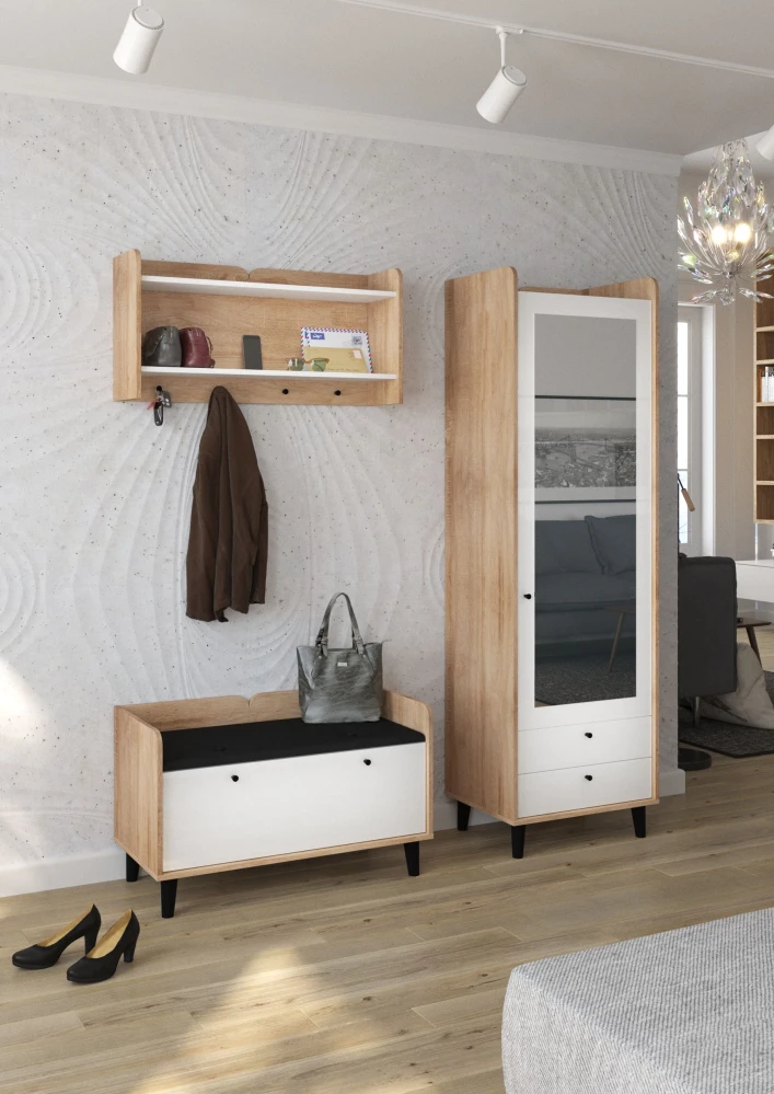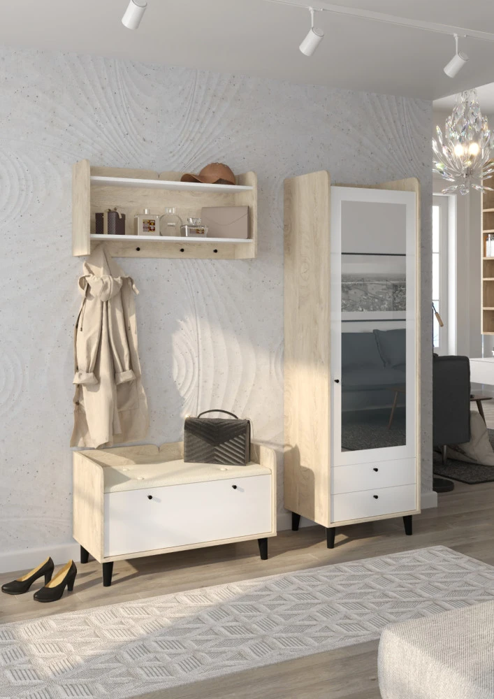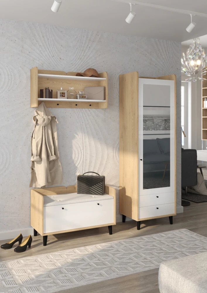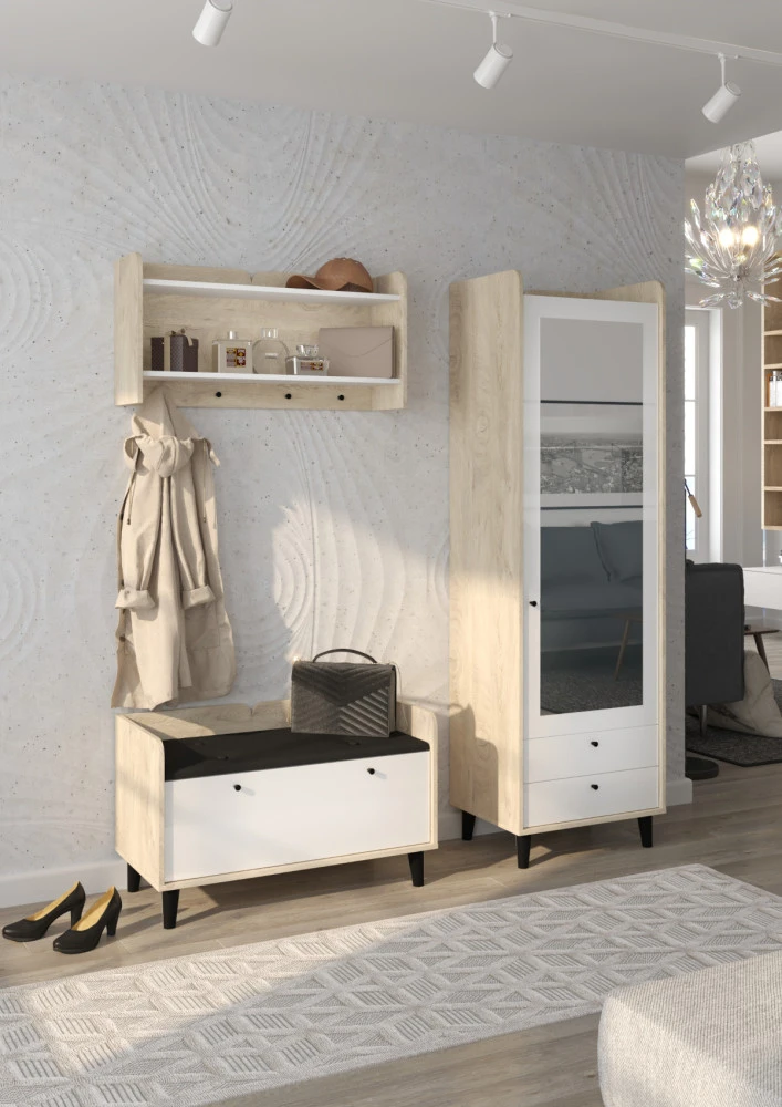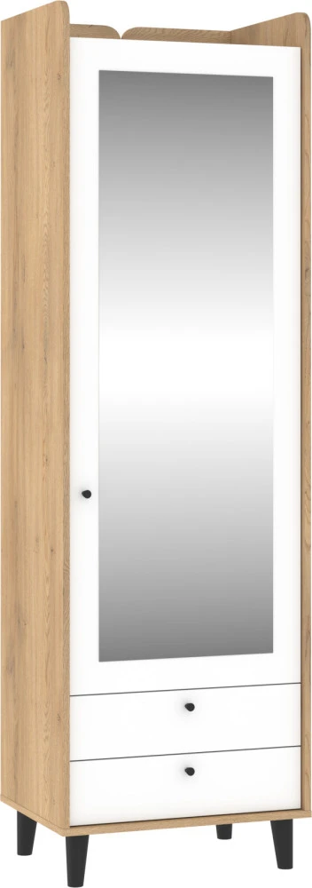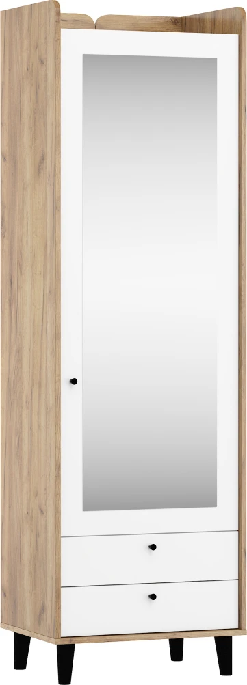 Hledáte funkční, trendový a nadčasový nábytek, který je propracovaný a snadno se udržuje? Systém Dolce uspokojí vaše nároky na design i funkčnost.Kolekce nábytku Dolce vyniká designem, vysokou funkčností a čistými liniemi. Lamino materiál o síle 16 mm a 25 mm doplňují ABS hrany, které chrání nábytek proti mechanickému poškození. Skříňky i zásuvky se systémem tichého dovírání zvýší komfort užívání. Výrazným prvkem jsou černé dřevěné nožky různých výšek, které dodají celé kolekci originální vzhled. A nejen to, vyšší nožky jsou také praktické při uklízení. Vitríny jsou vybavené kouřovými skly, které ještě více zdůrazní originální vzhled systému. Černou barvu mají i úchyty a spolu s bílým leskem na předních plochách skvěle doplňují dřevodekory reflektující moderní trendy v bydlení. S kolekcí Dolce nemůžete šlápnout vedle.Vnitřní vybavení skříně obsahuje šatní výsuv a nad ním 1 polici. Skříň má 2 praktické zásuvky a zrcadlové dveře. Zrcadlo prosvětlí a opticky zvětší místnost, proto je skříň vhodná také do předsíní nebo chodeb.
