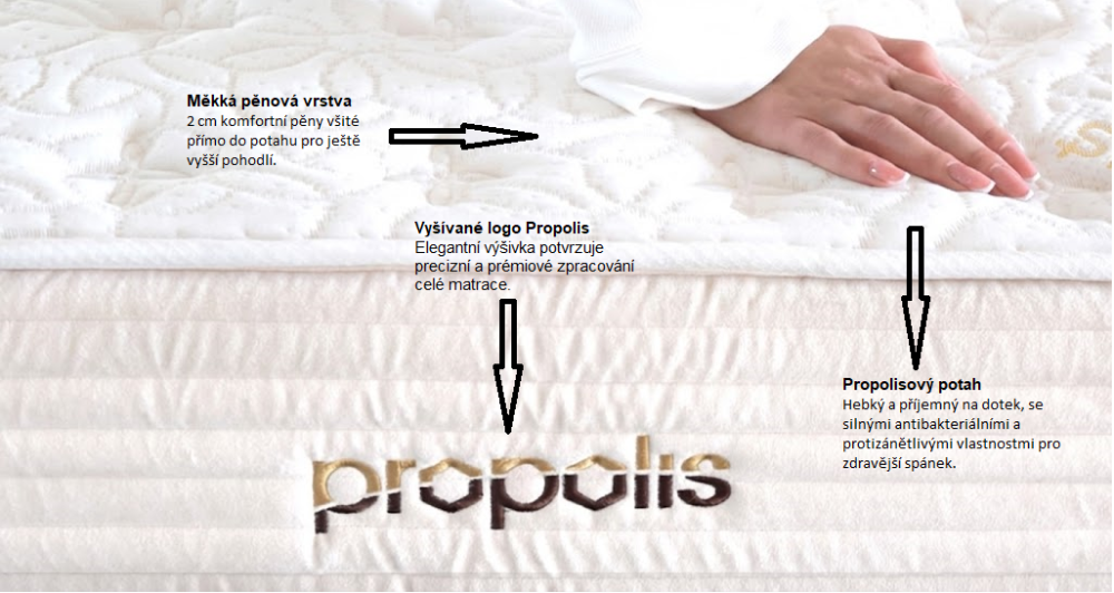 Propolis je včelí produkt s mimořádnými antibakteriálními a antialergenními účinky. Pomáhá udržovat matraci hygienicky čistou, omezuje množení bakterií i roztočů a vytváří zdravější mikroklima pro spánek.
