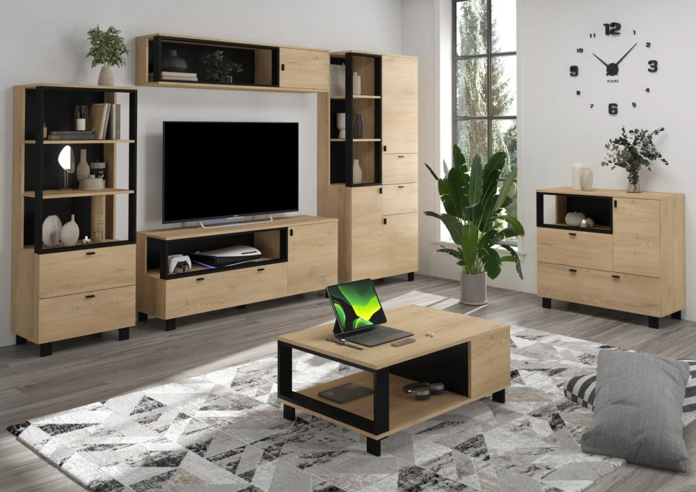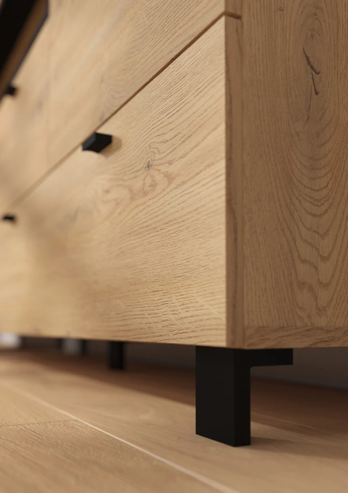 Regál Vegas 08 vás zaujme svým moderním designem a přírodním provedením v kombinaci s černými či bílými detaily. Je vyroben z kvalitních lamino desek o síle 16 mm. Desky mají ABS hranění, které zvyšuje odolnost pro odštípnutí hran. Součástí zásuvek a dvířek jsou jednoduché černé kovové úchyty, zároveň mají zabudovaný systém tichého dovírání. Nábytek stojí na černých kovových nožkách o velikosti 8 cm, které provzdušní váš celkový prostor. Nabízíme vám několik barevných variant. Součástí regálu jsou 2 zásuvky na kovových pojezdech. Nad zásuvkami jsou 3 otevřené niky k vystavení vašich oblíbených dekorací, knih či fotografií.Doporučujeme si vybrat z dalších komodit systému Vegas, ze kterých si vytvoříte svůj vysněný interiér. Nábytek dodáváme v demontu.
