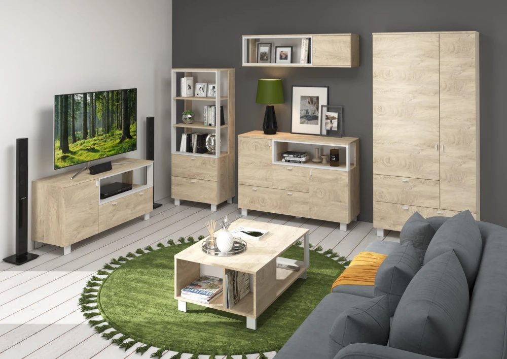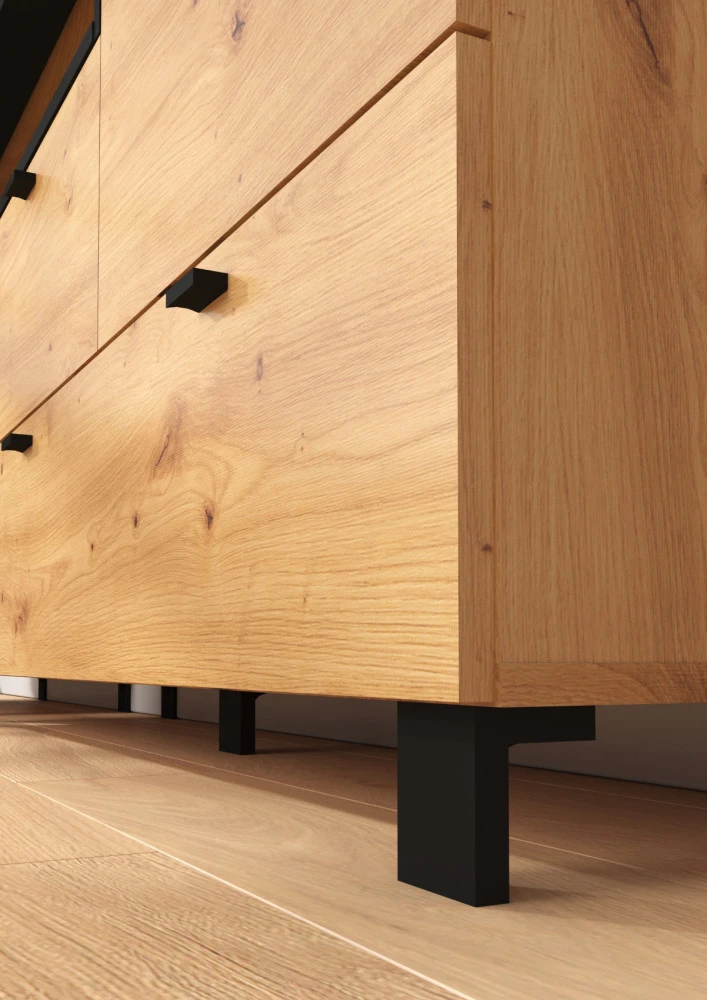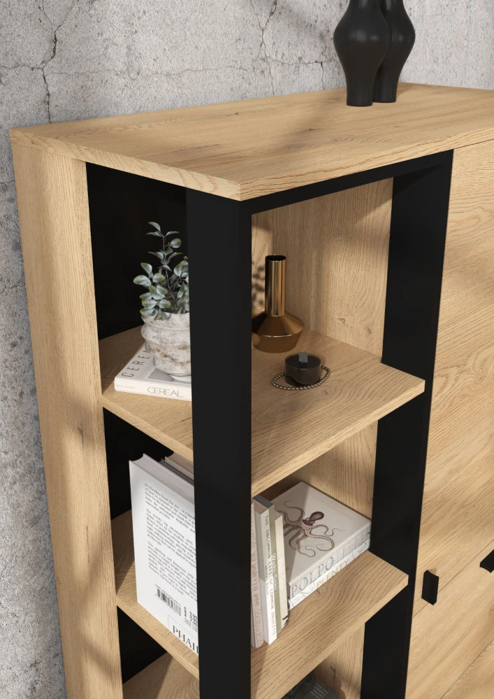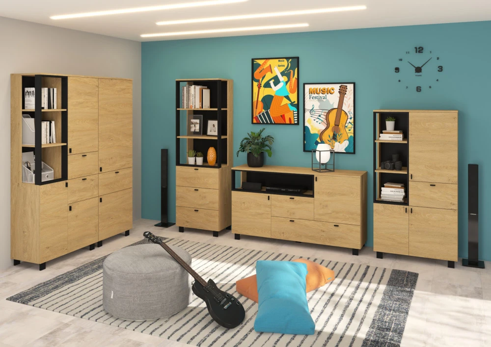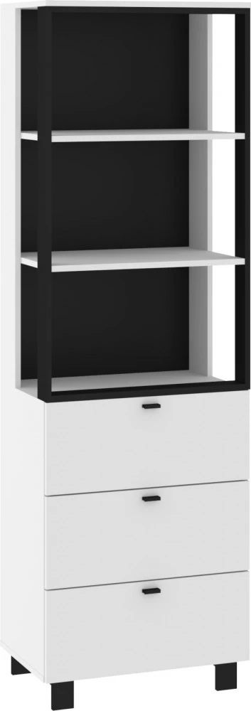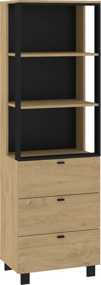 Regál Vegas 11 vás zaujme svým moderním designem a přírodním provedením v kombinaci s černými či bílými detaily. Je vyroben z kvalitních lamino desek o síle 16 mm. Desky mají ABS hranění, které zvyšuje odolnost pro odštípnutí hran. Součástí zásuvek a dvířek jsou jednoduché černé kovové úchyty, zároveň mají zabudovaný systém tichého dovírání. Nábytek stojí na černých kovových nožkách o velikosti 8 cm, které provzdušní váš celkový prostor. Nabízíme vám několik barevných variant. Součástí regálu jsou 3 zásuvky na kovových pojezdech. Nad zásuvkami jsou 3 otevřené niky k vystavení vašich oblíbených dekorací, knih či fotografií.Doporučujeme si vybrat z dalších komodit systému Vegas, ze kterých si vytvoříte svůj vysněný interiér. Nábytek dodáváme v demontu.