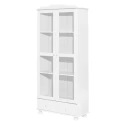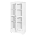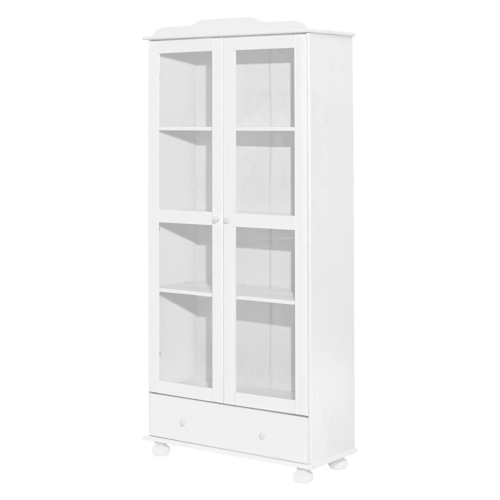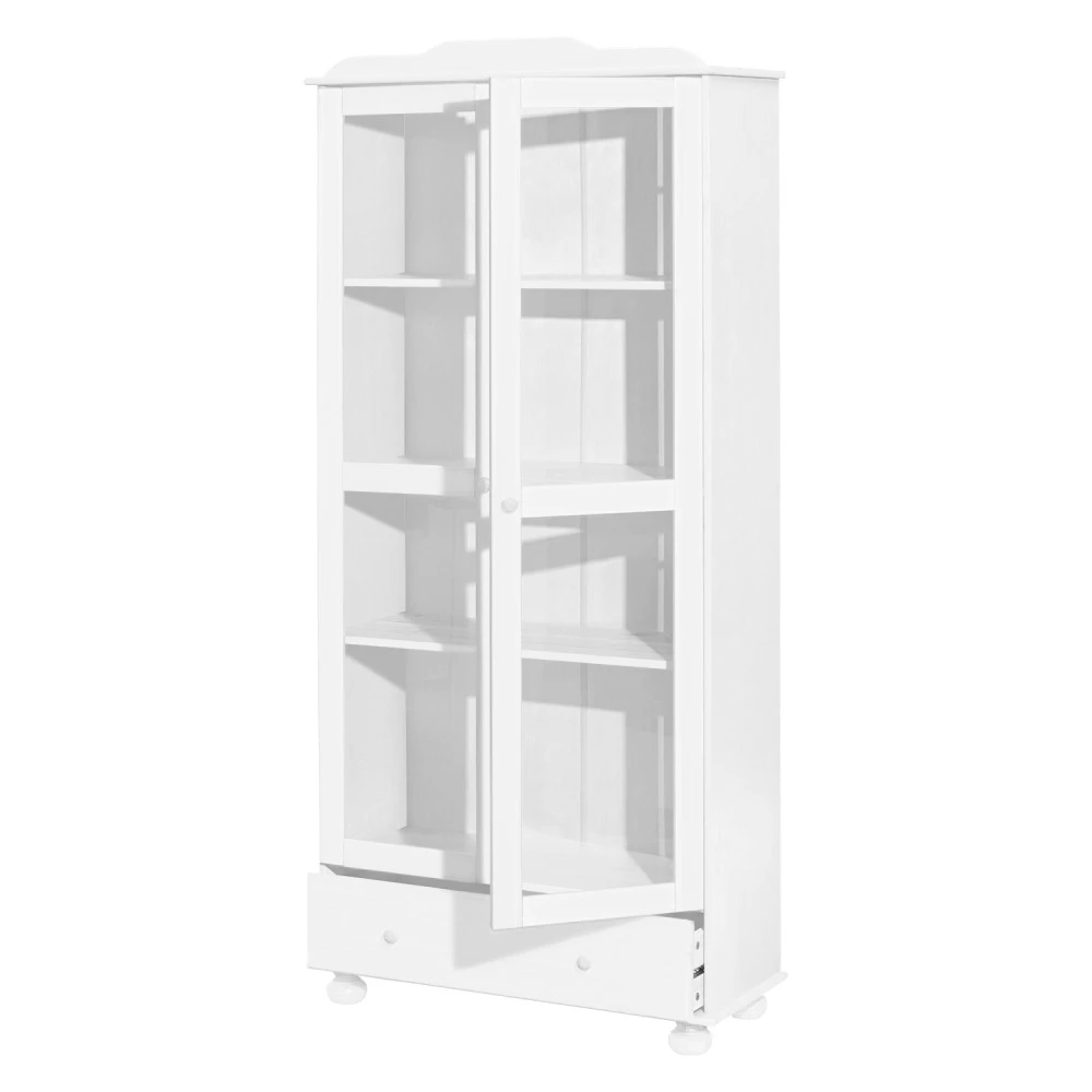 materiál masiv borovice, barevné provedení bílý lak široká zásuvka s kovovými pojezdy, 2 prosklené dveře 2 variabilní a 1 pevná police