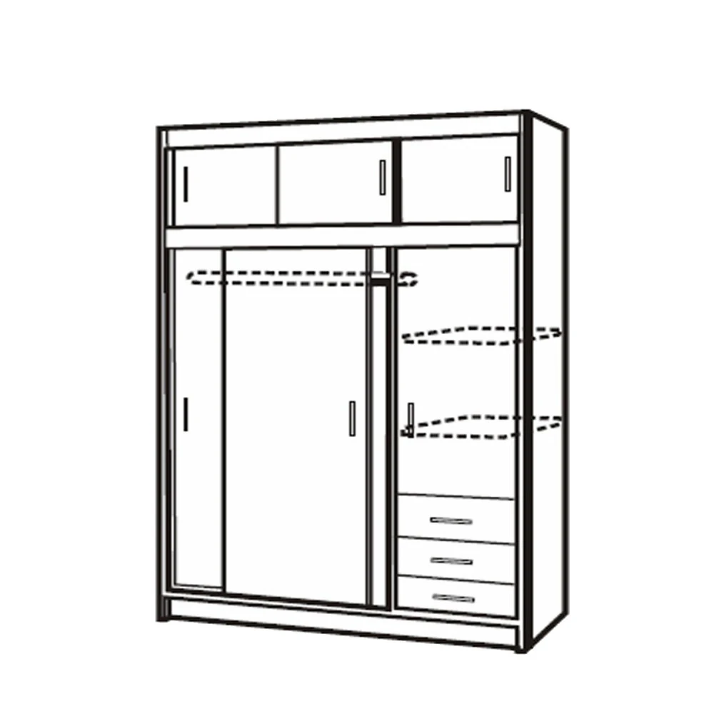 barevné provedení buk posuvné dveře, cena včetně nástavce, prostor dělený v poměru 2:1 širší část šatní tyč, užší část 2 variabilní police, 3 zásuvky s kovovými pojezdy barevné varianty: 3000B bílá, 53000 dub Sonoma