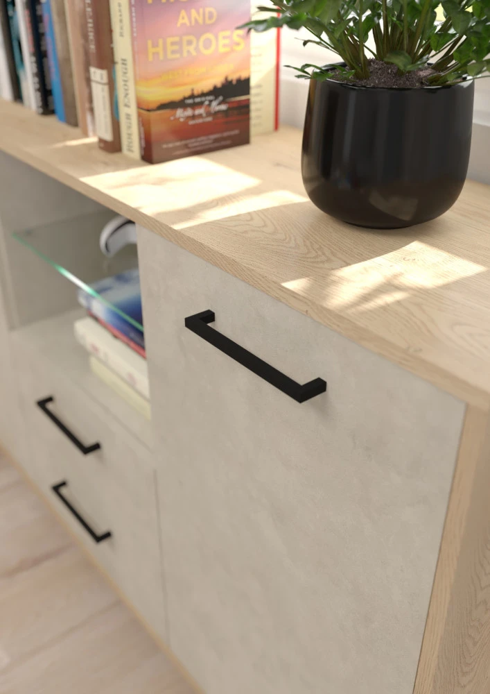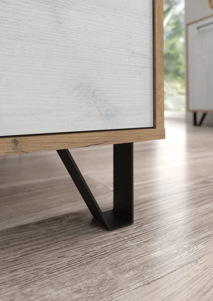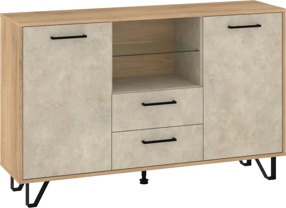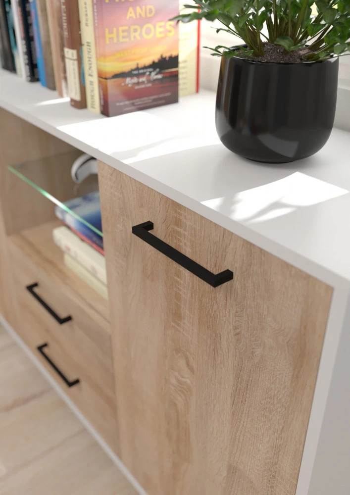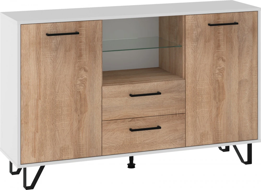Komoda Boss vás zaujme svým moderním elegantním designem a barevným provedením s přírodními detaily. Je vyrobena z kvalitních lamino desek o síle 16 mm. Desky mají ABS hranění, které zvyšuje odolnost pro odštípnutí hran. Součástí zásuvek a dvířek jsou jednoduché kovové úchyty a zároveň mají zabudovaný systém tichého dovírání. Nábytek stojí na kovových nožkách, které provzdušní váš interiér. Nabízíme vám několik barevných variant.Součástí komody jsou 2 dvířka, za kterými jsou vloženy 4 lakované police. Mezi dvířky jsou 2 zásuvky na kovových pojezdech a nad nimi je skleněná police k vystavení vašich oblíbených dekorací, knih nebo rámečků s fotografiemi.Doporučujeme si vybrat z dalších komodit systému Boss, ze kterých si vytvoříte svůj vysněný obývací pokoj, relaxační místnost či pracovnu.Nábytek dodáváme v demontu.