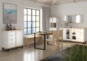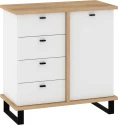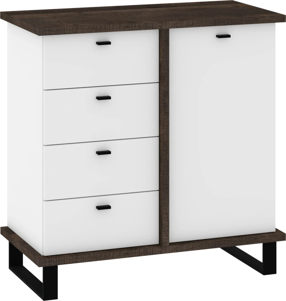 Komoda Cross 04 disponuje 4 zásuvkami a skříňkou se 2 poličkami uvnitř. Nožky jsou vysoké 12 cm.
