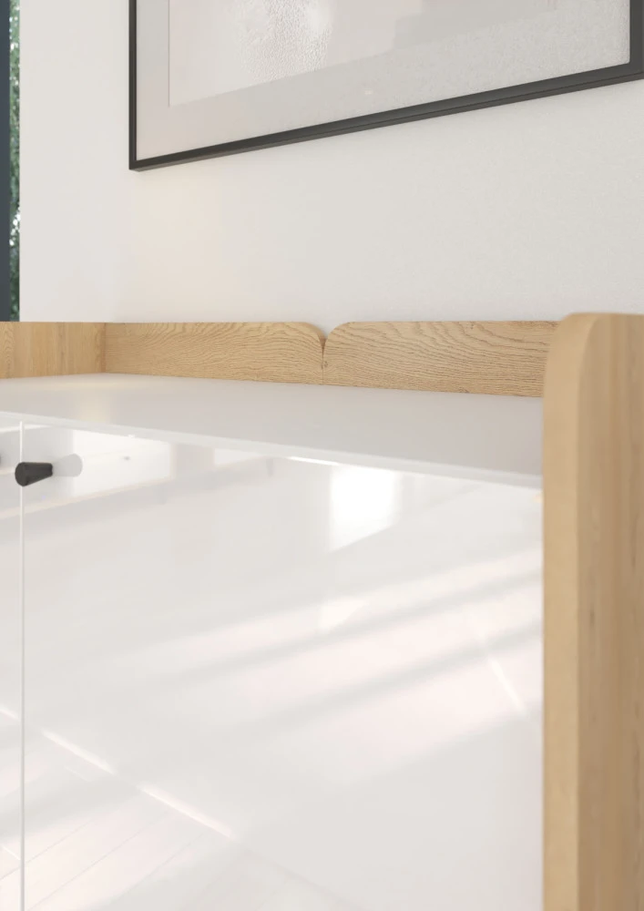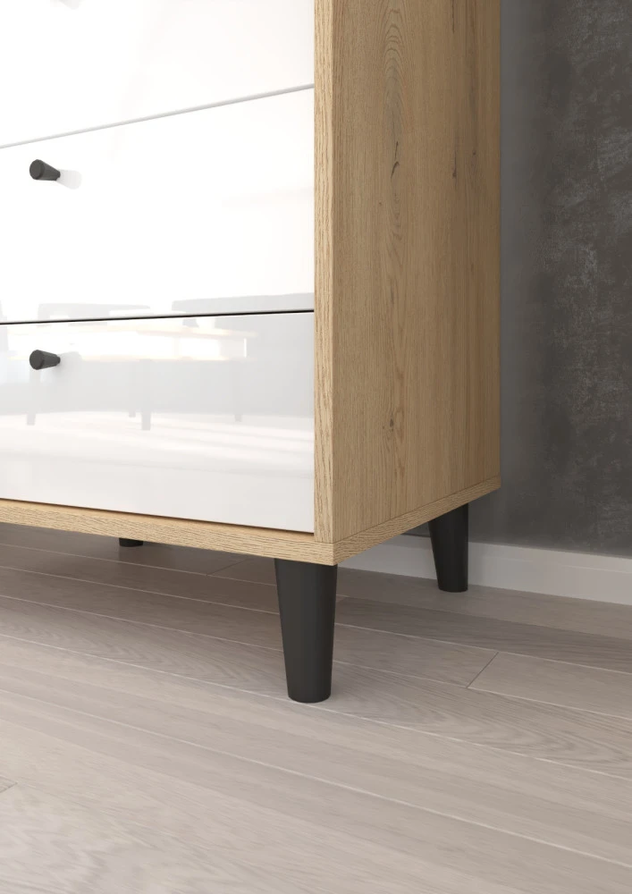 Kombinovaná komoda Dolce 06 disponuje 4 zásuvkami a 2 skříňkami s plnými dvířky. Uvnitř skříněk naleznete 1 poličku. Nožky jsou vysoké 12 cm.