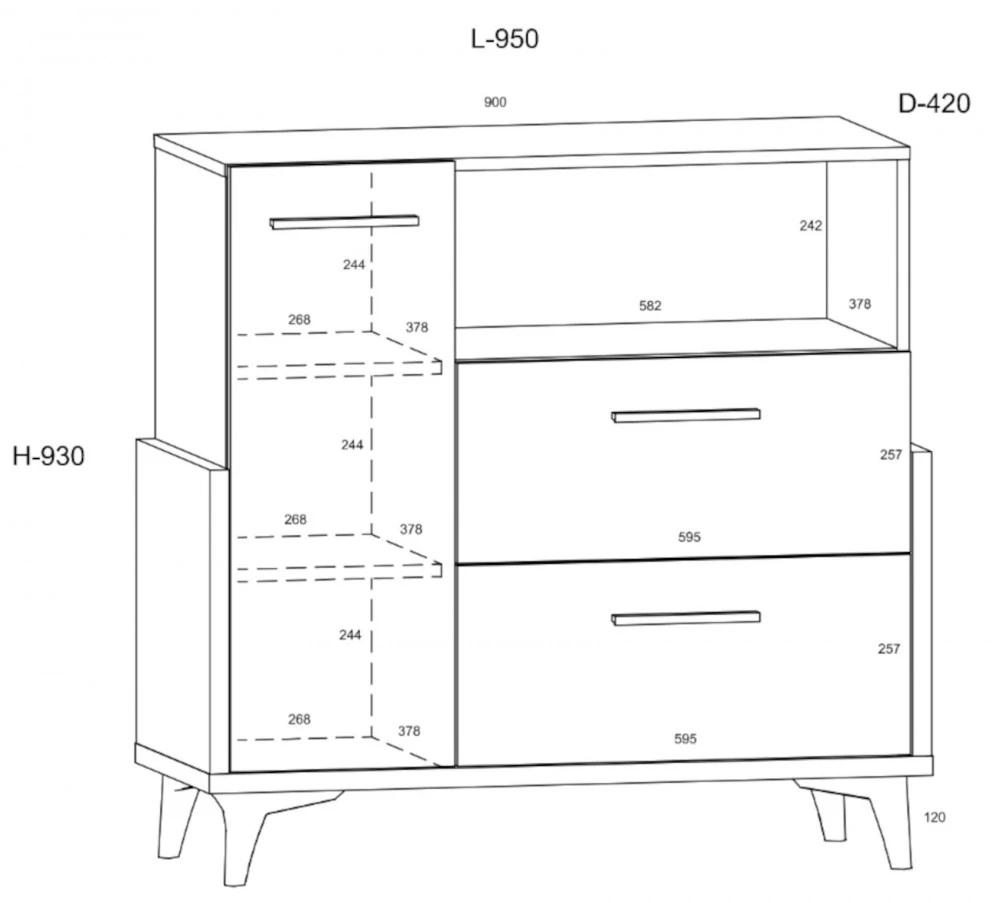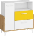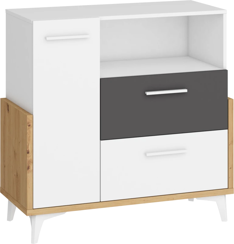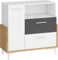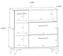 Komoda je vybavená 2 prostornými zásuvkami, policovým prostorem a skříňkou se 2 poličkami uvnitř. Dodáváme v demontu.