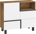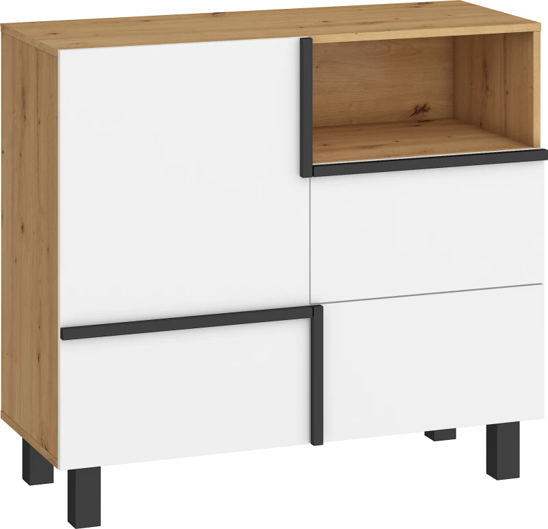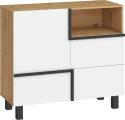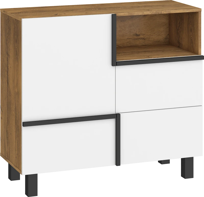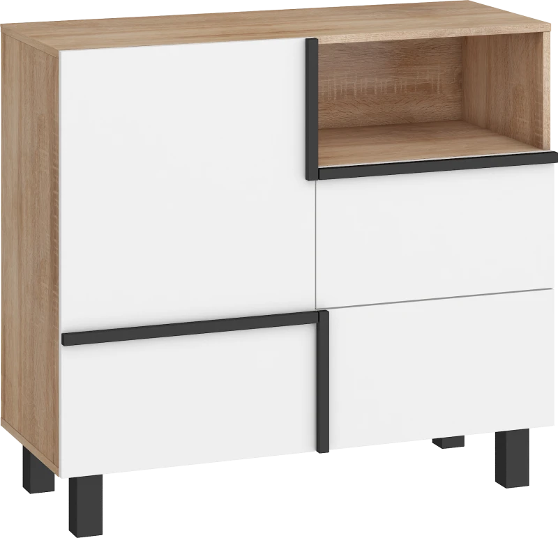 Komoda patří ke kolekci nábytku LARS, která nabízí škálu produktů, z nichž si můžete vybavit obývák či předsíň. Kolekci charakterizuje rafinované provedení úchytek a 12 cm dřevěné nožky. Barevná kombinace sází na jistotu, kterou je bílá barva na předních plcohách nábytku. Ta je v kombinaci s teplými dřevodekory, které navozují útulný a teplý domov, zárukou moderního a vzdušného stylu.