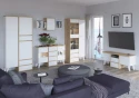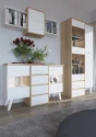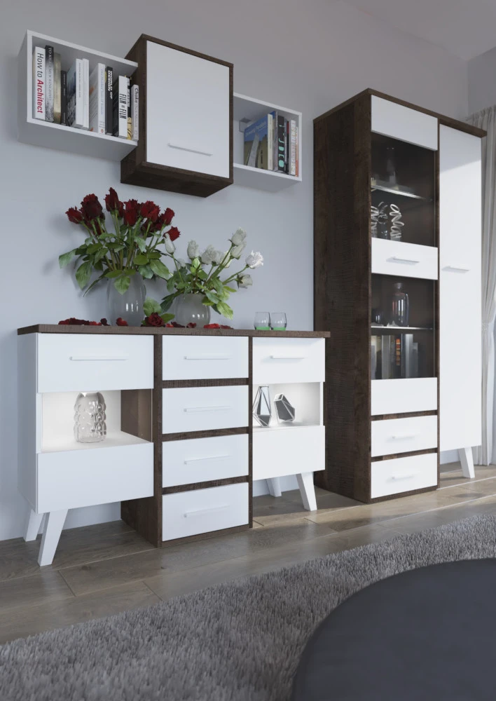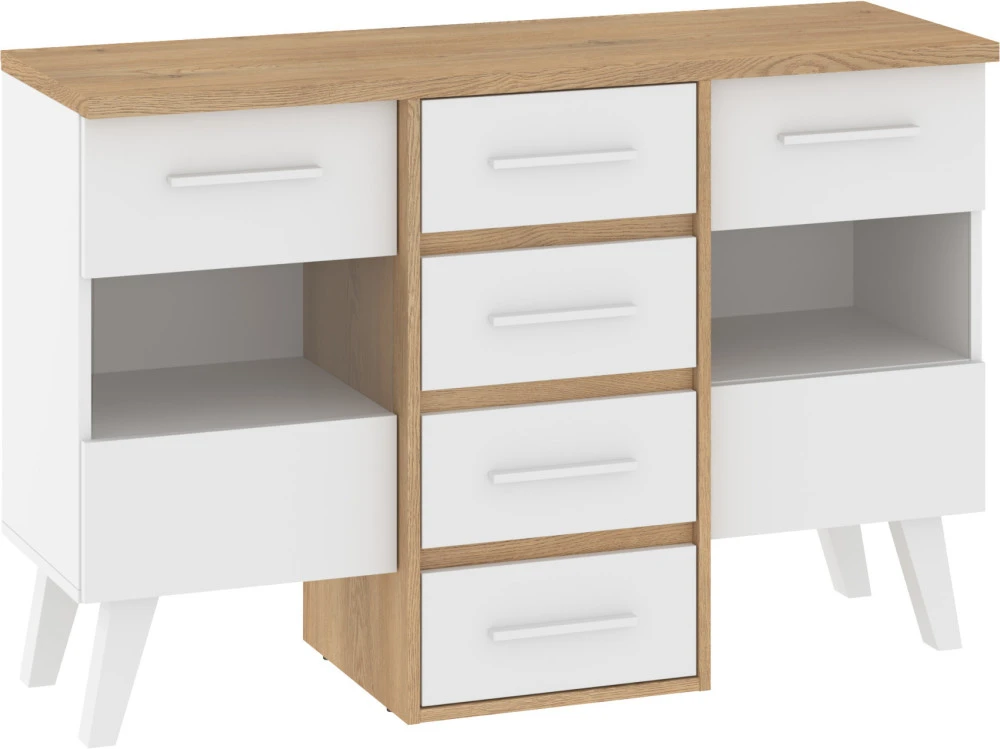Komoda Nordis 05 stylově doplní vaši domácnost. 4 praktické zásuvky a 2 částečně prosklené skříňky se 2 poličkami vám poskytnou dostatek úložného prostoru.