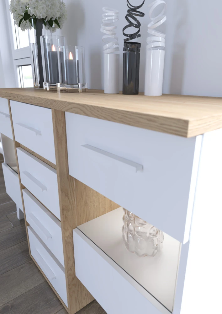 Komoda patří ke kolekci systémového nábytku Nordis, kterou si můžete vybavit nejen pracovnu, ale i obývací pokoj nebo předsíň. Nordis má nadčasový design, který sází na čistou bílou barvu, jíž vkusně doplňují dřevodekory v přírodním odstínu. Nebo si můžete systém vybrat v nestárnoucí klasické bílo-černé kombinaci. Materiál je kvalitní lamino o síle 25 mm na korpusech nábytku, dvířka a čela zásuvek jsou z 16 mm silných desek. Samozřejmostí jsou ABS hrany, které váš nový nábytek ochrání před odštípnutím či mechanickým poškozením. Skříňky disponují tichým dovíráním.