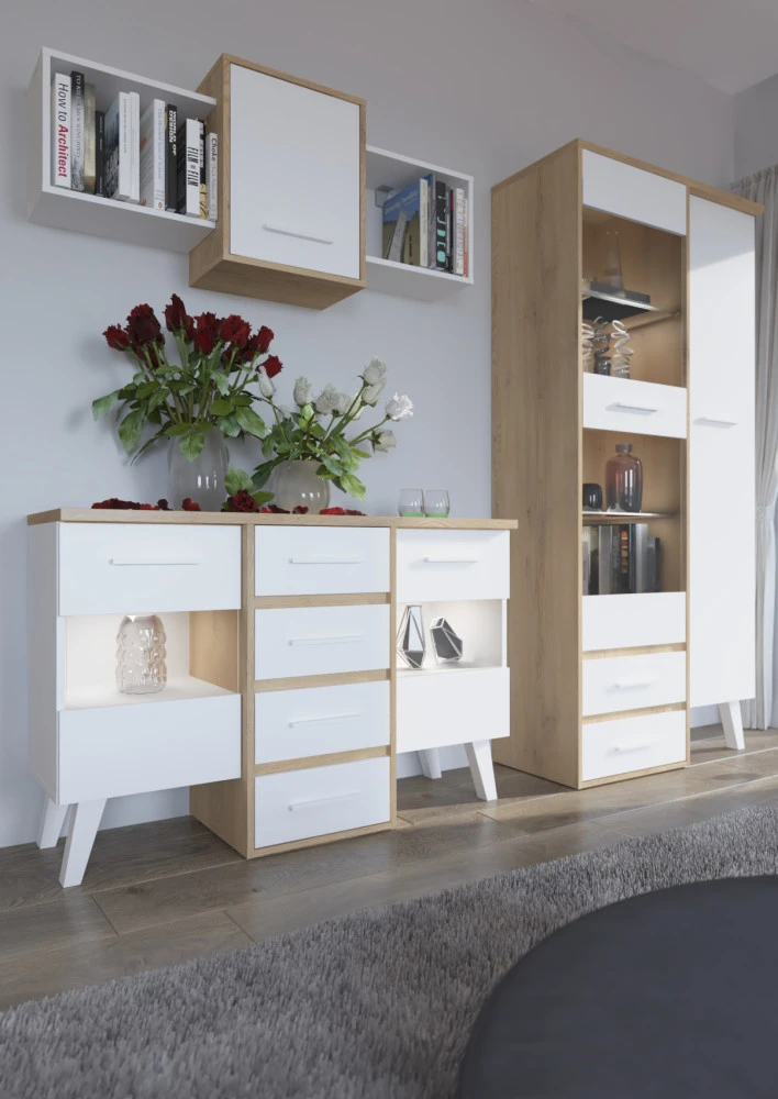 Výrazným designovým prvkem jsou 18 cm vysoké dřevěné nožky, díky nimž se úklid pod nábytkem stane snadnou a rychlou záležitostí. Kolecke Nordis vám nabízí 18 libovolně kombinovatelných prvků. Pořiďte si domů detailně propracovaný, funkční a nadčasový nábytek!