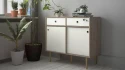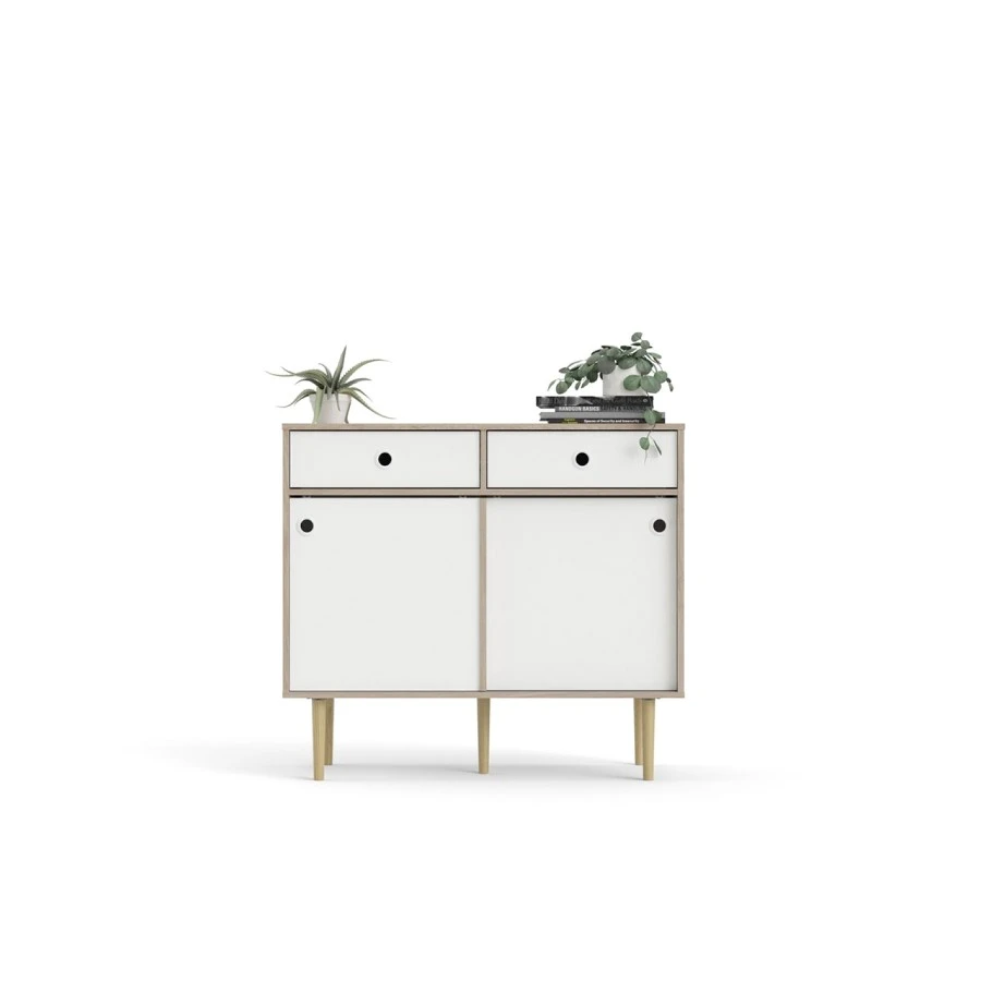 Komoda Ruby díky svému provední nabízí univerzální použití a dostatek úložného prostoru. S touto komodou budete mít doma přehledný a organizovaný pořádek. A pokud máte rádi retro styl, pak je tato komoda pro Vás jako stvořená. Komoda je zhotovená z lamina které je odolné a snadné na údržbu. Retro vzhled zdůrazňují vysoké nožky, kulaté výřezy místo úchytek a posuvné dvířka. Komodu nabízíme ve dvou barevných provedeních. Je dodávaná v demontu a součástí je montážní plánek včetně všech potřebných spojovacích materiálů.