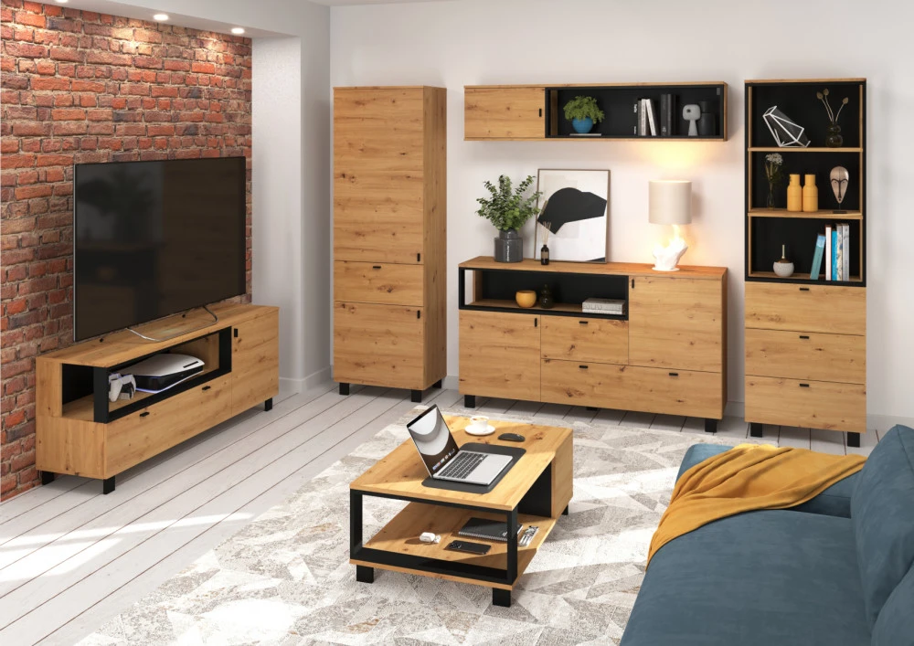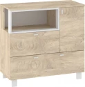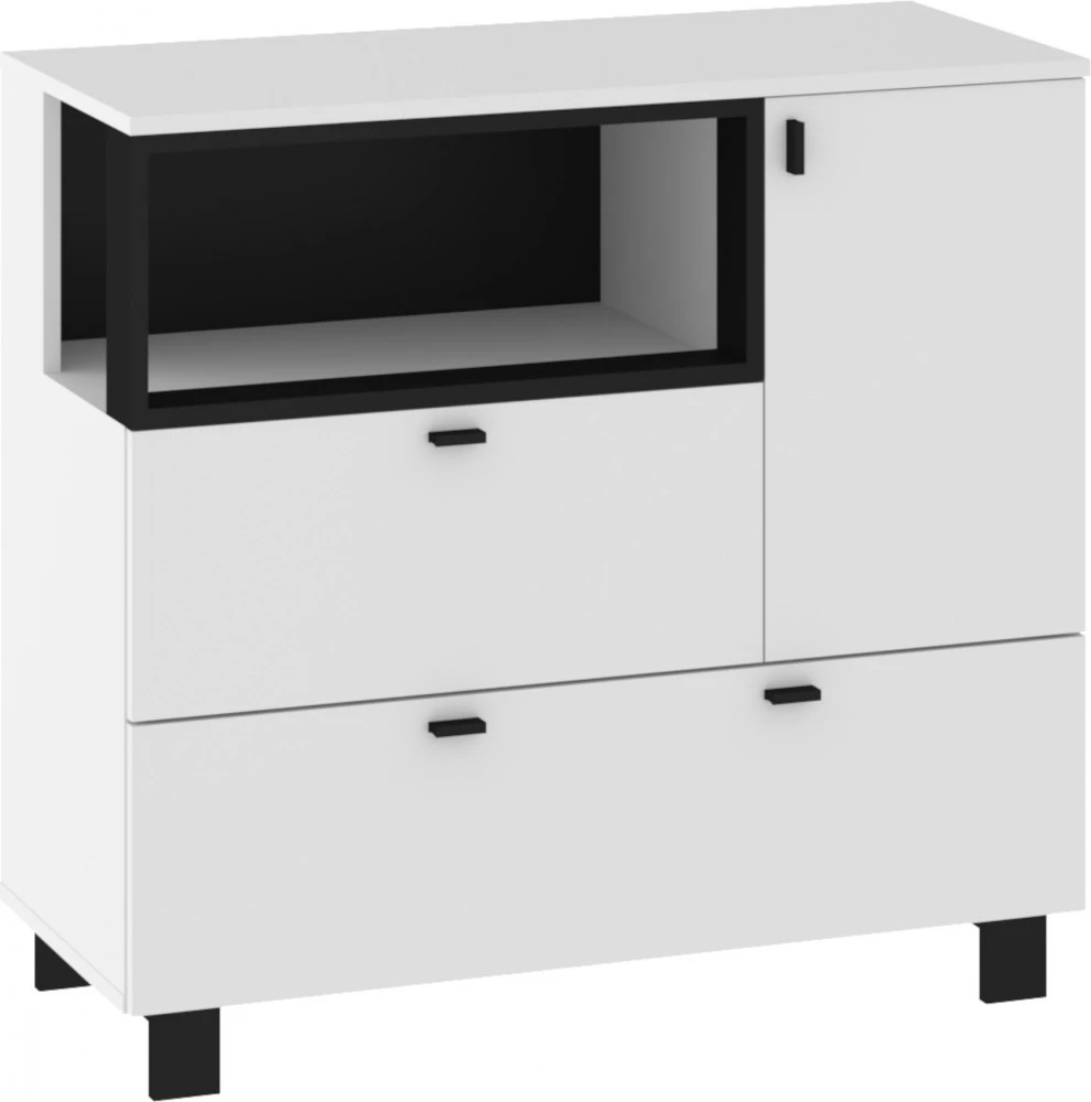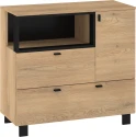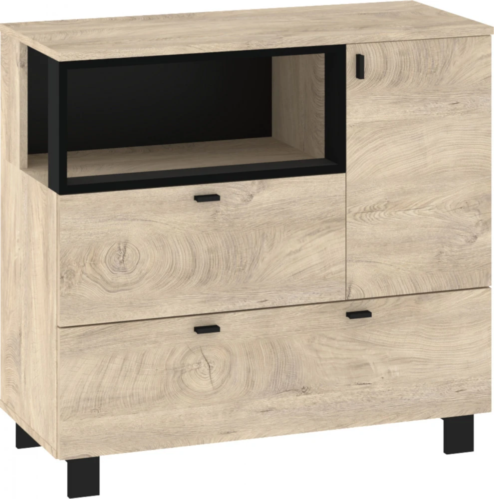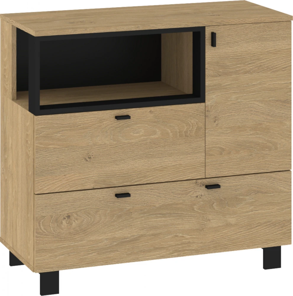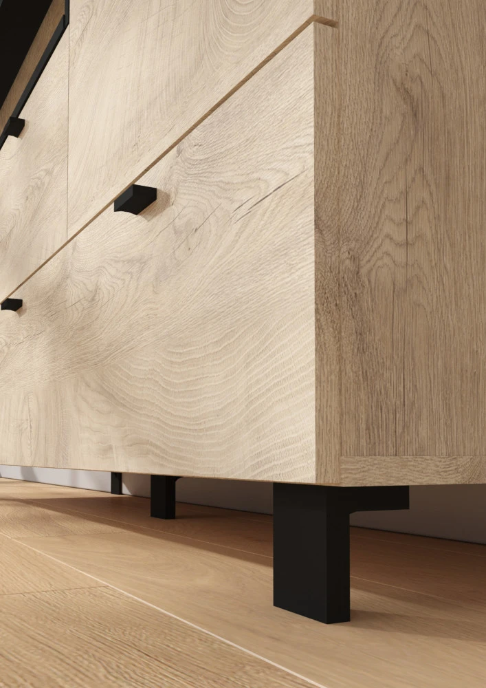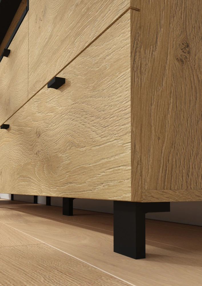 Komoda Vegas 01 vás zaujme svým moderním designem a přírodním provedením v kombinaci s černými či bílými detaily. Je vyrobena z kvalitních lamino desek o síle 16 mm. Desky mají ABS hranění, které zvyšuje odolnost pro odštípnutí hran. Součástí zásuvek a dvířek jsou jednoduché černé kovové úchyty, zároveň mají zabudovaný systém tichého dovírání. Nábytek stojí na černých kovových nožkách o velikosti 8 cm, které provzdušní váš celkový prostor. Nabízíme vám několik barevných variant. Součástí komody jsou dvířka, za kterými je vložena 1 lakovaná police. Ve spodní a levé části jsou 2 zásuvky na kovových pojezdech. Nad zásuvkou je otevřené nika k vystavení vašich oblíbených dekorací, knih či fotografií.Doporučujeme si vybrat z dalších komodit systému Vegas, ze kterých si vytvoříte svůj vysněný interiér. Nábytek dodáváme v demontu.