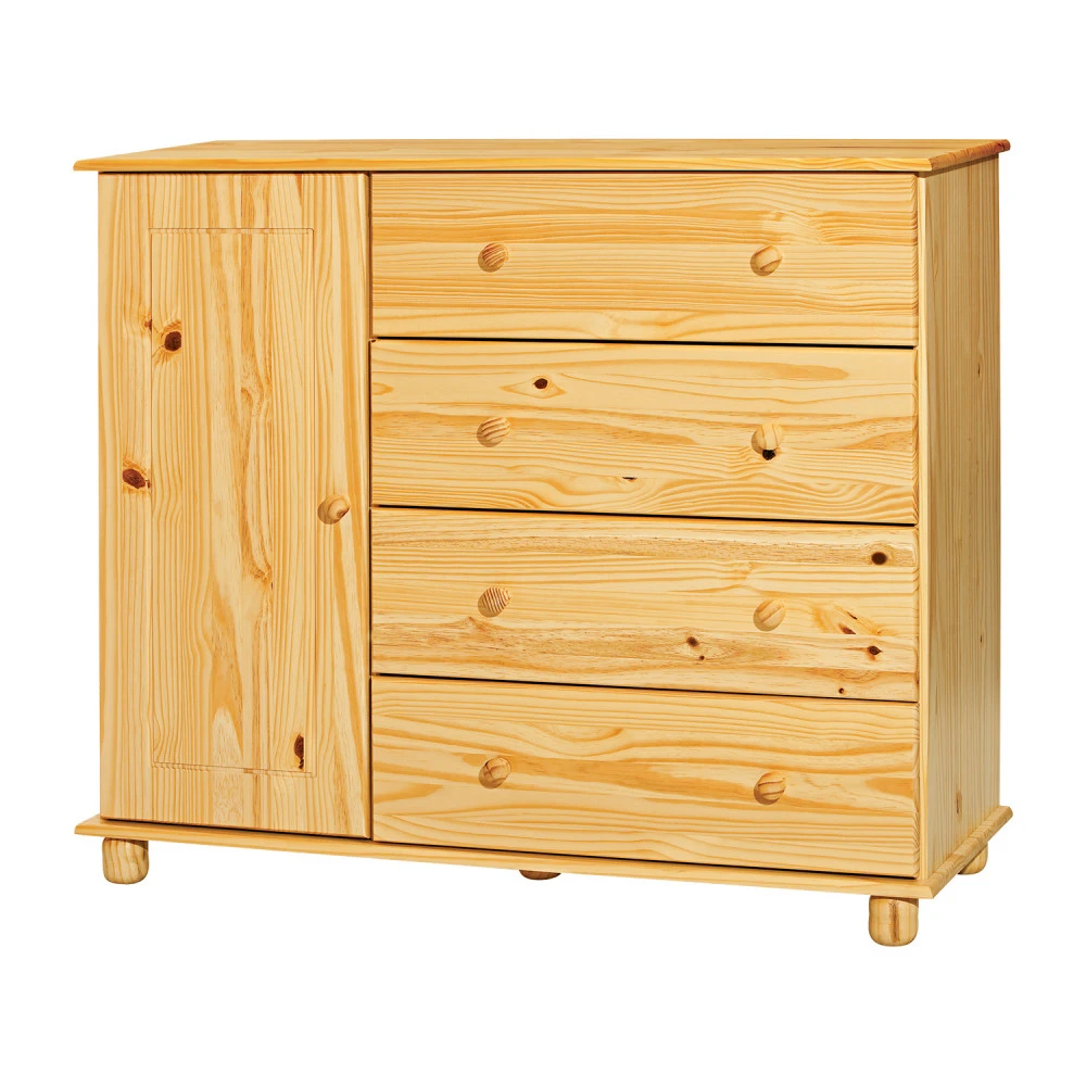 materiál masiv borovice, lakované provedení skřínka s dvířky a variabilní policí 4 široké zásuvky s kovovými pojezdy, hloubka zásuvky 33,5 cm