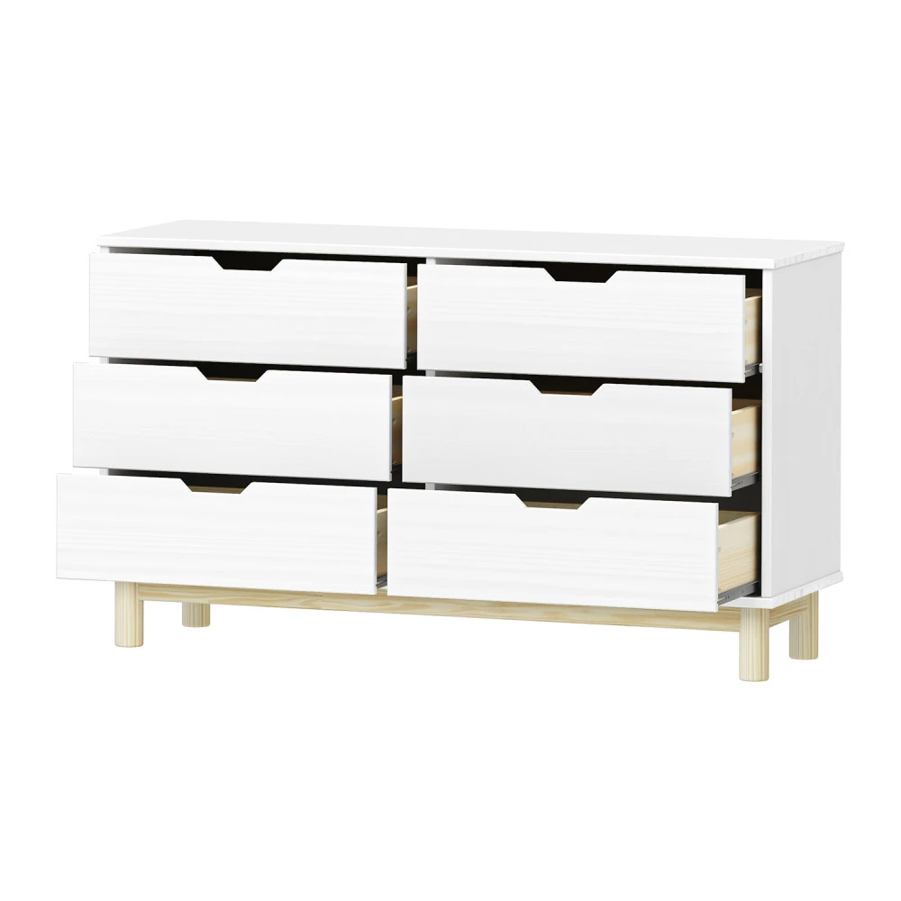 materiál masiv borovice, barevné provedení bílý lak 6 zásuvek s kovovými pojezdy
