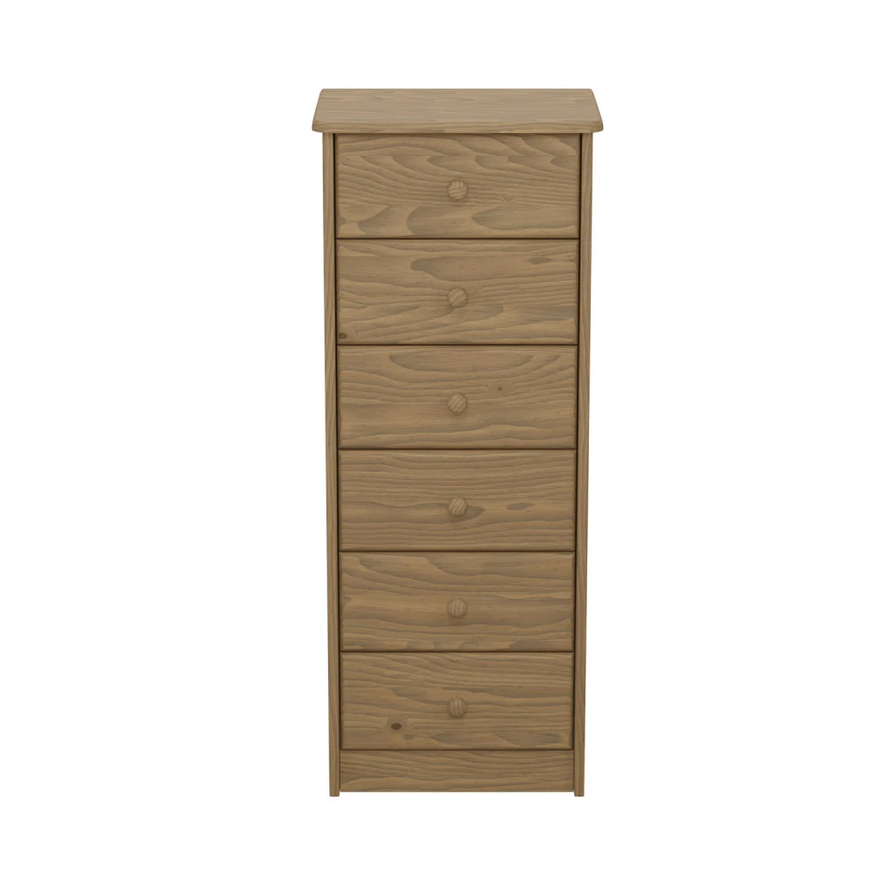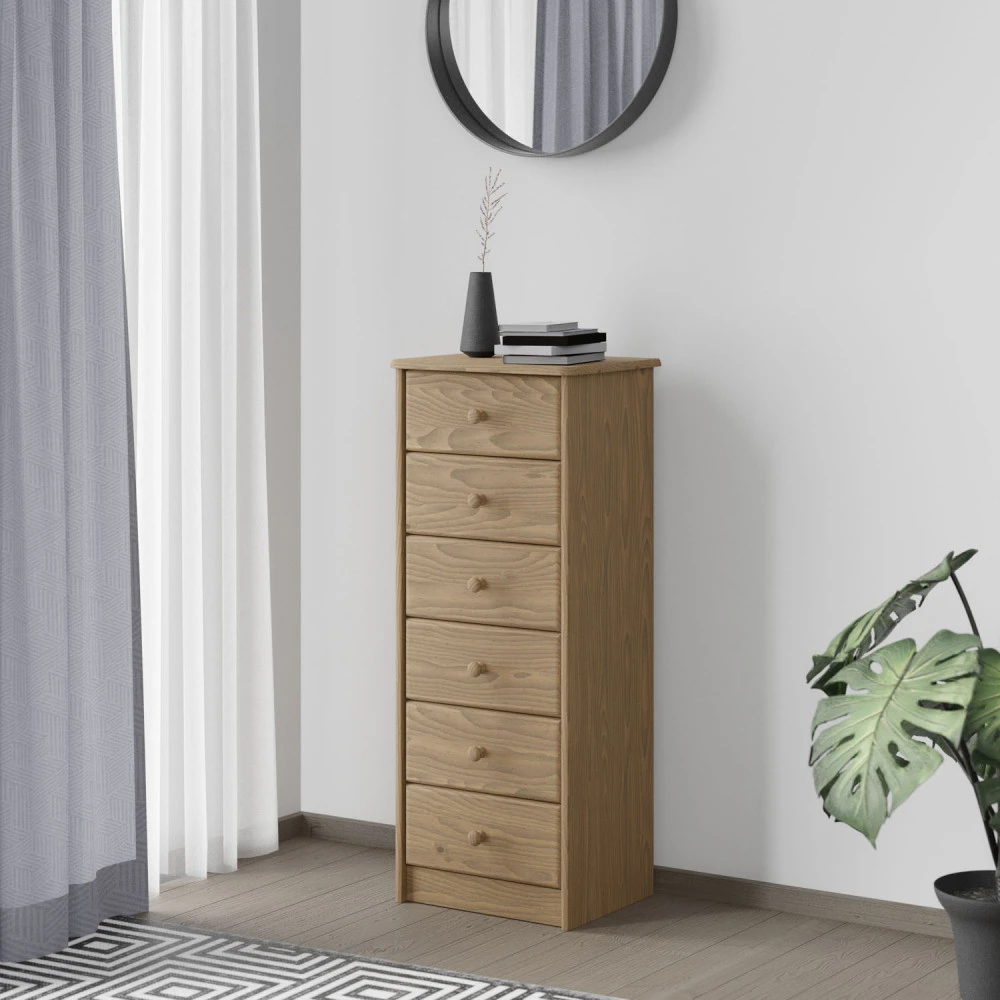 materiál masiv borovice, voskované provedení 6 zásuvek s kovovými pojezdy, hloubka zásuvky 27,5 cm