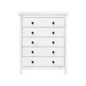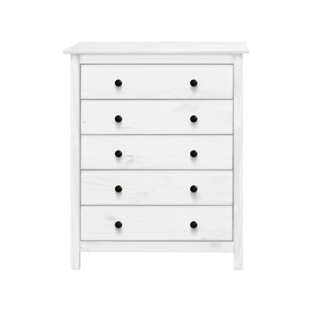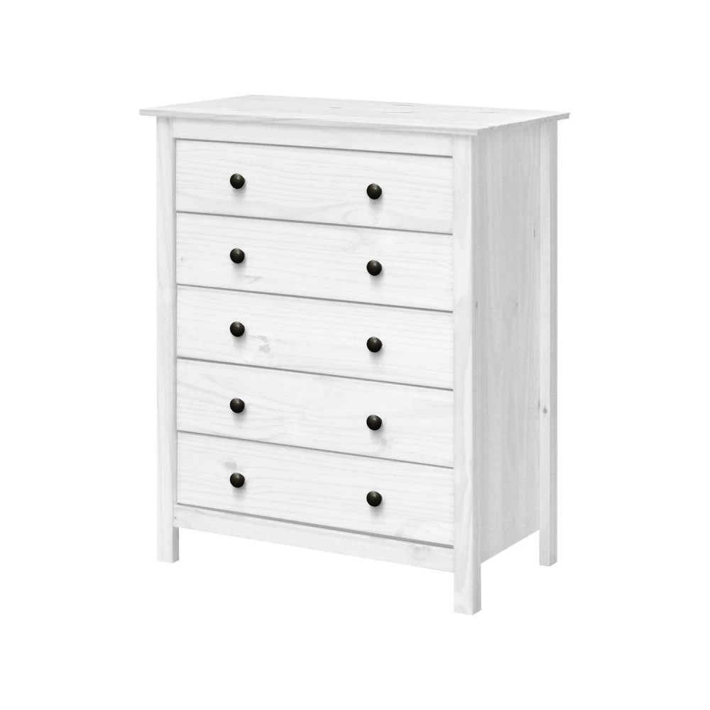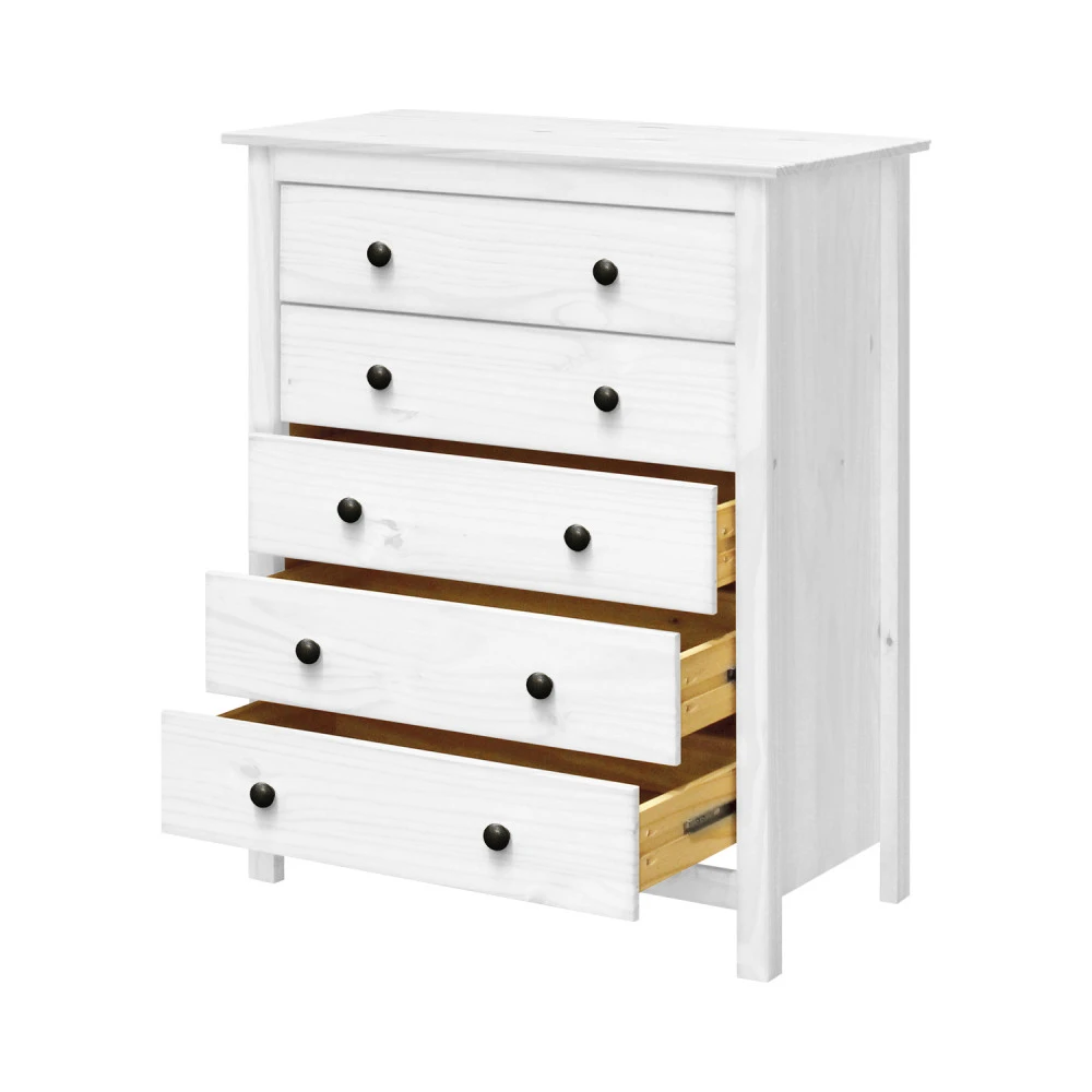 materiál masiv borovice, barevné provedení bílý lak kovové úchytky pět zásuvek s kovovými pojezdy