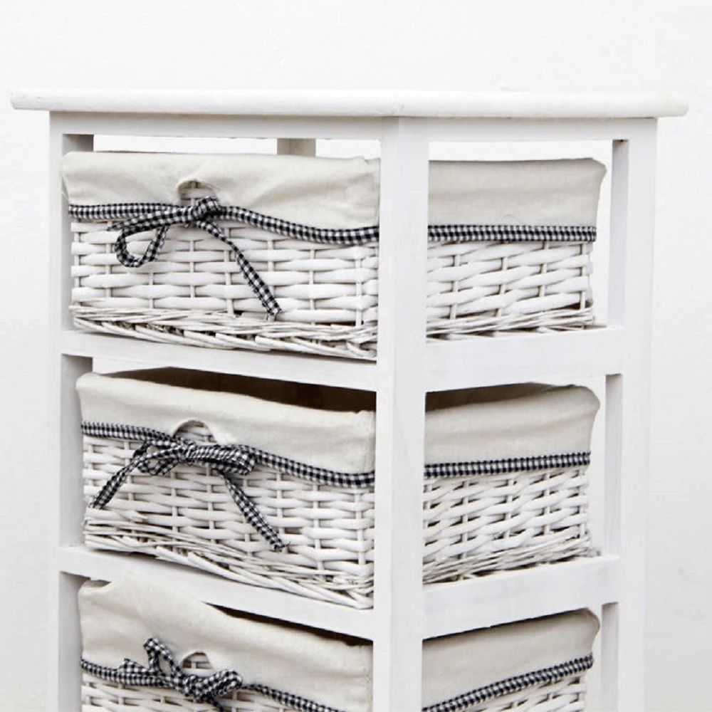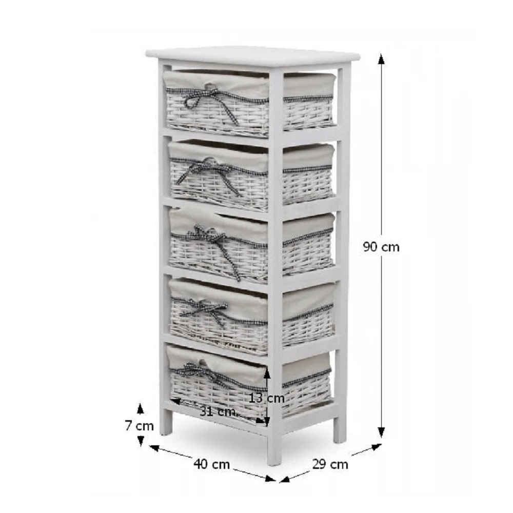 komoda s pevným rámem a 5 proutěnými košíky, materiál dřevo / proutí, kombinace starobílé barvy, rozměry (ŠxVxH) 40x90x29 cm.