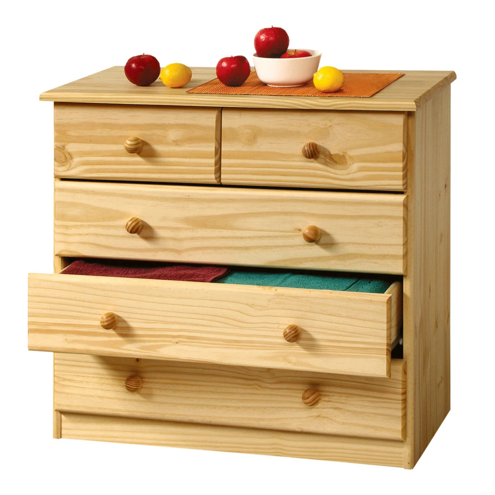materiál masiv borovice, lakované provedení 2 úzké a 3 široké zásuvky s kovovými pojezdy, hloubka zásuvky 32,5 cm