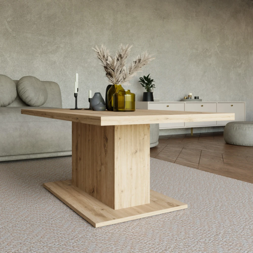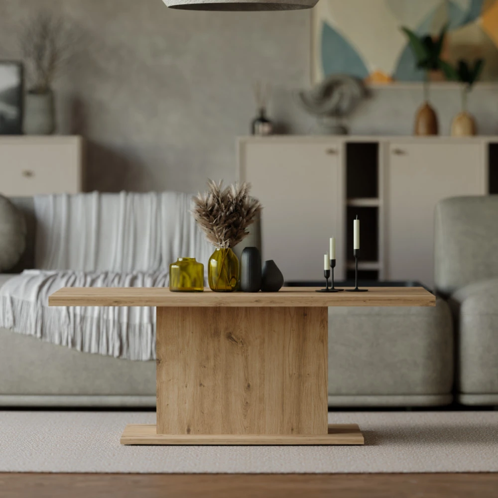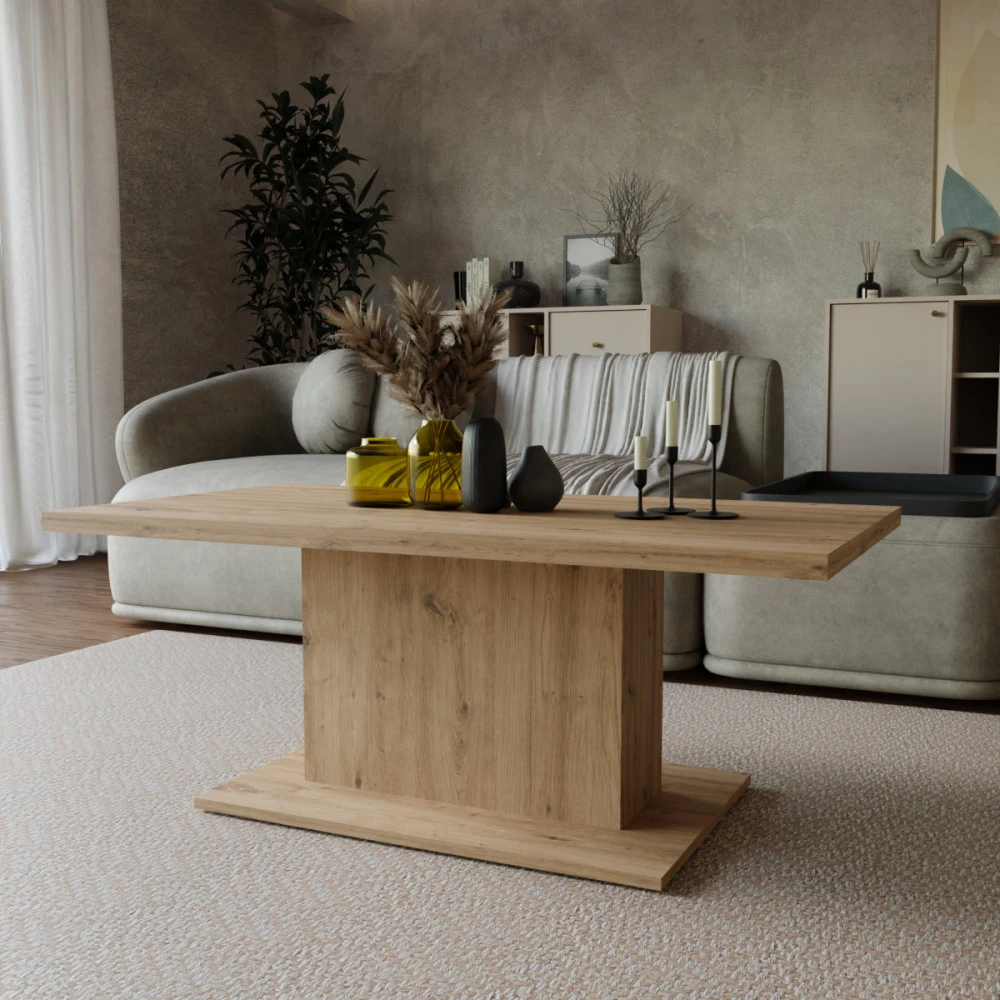 Konferenční stolek Denis je atraktivní stolek, který je vyrobený z lamina ve velmi oblíbeném a moderním dekoru dub artisan. Stolek je dostatečně velký na vše, co si budete potřebovat odložit. Hrnek s kávou nebo čajem, talíř, knihu, telefon, notebook, nebo klidně i unavené nohy po celodenním maratonu. Stolek je dodávaný v demontu. Součástí balení je montážní plánek včetně všech potřebných spojovacích materiálů. Vyobrazené doplňky a dekorace nejsou v ceně.