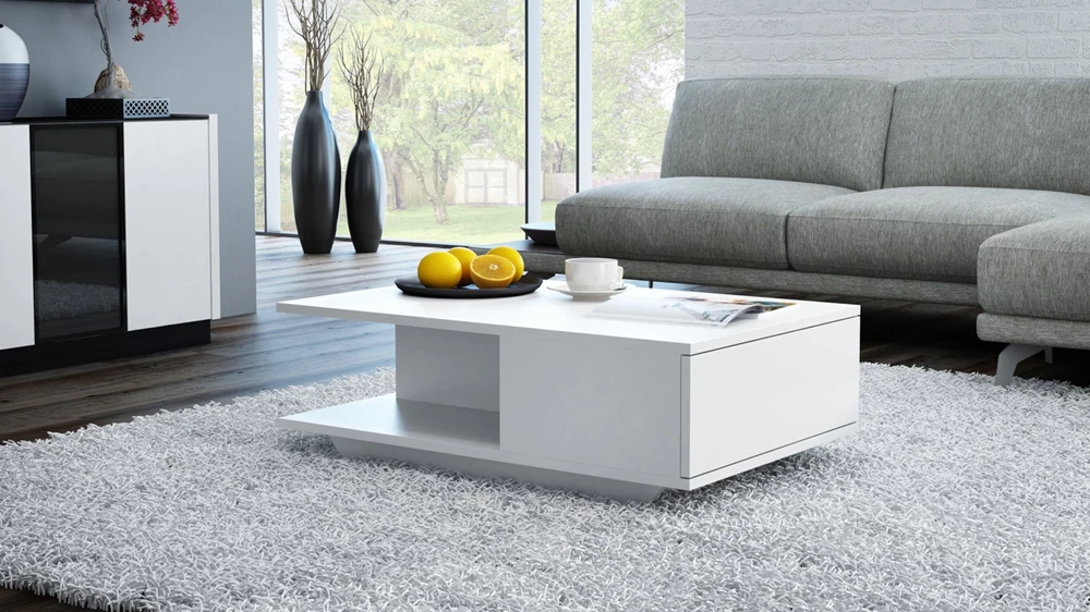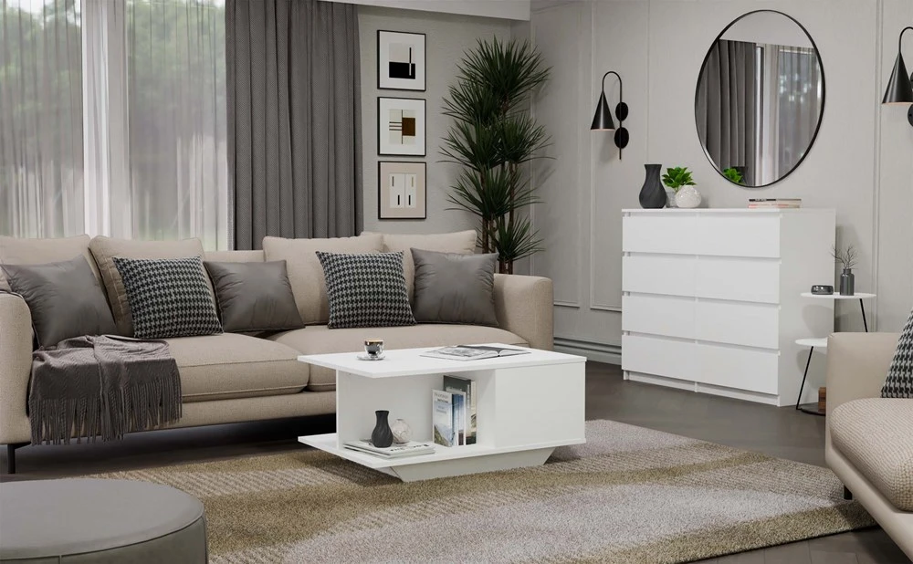 Konferenční stolek Derik v minimalistickém designu podtrhne moderní charakter každého obývacího pokoje či kanceláře. Je vyrobený ze snadno udržovatelného lamina. Stolek nabízí praktický úložný prostor s dvířky TIP-ON bez úchytek, které lze snadno otevřít lehkým stiskem. Dveře se otevírají směrem dolů do polohy, která je pro uživatele pohodlná. Chcete-li je zavřít, stačí lehce stisknout přední část.