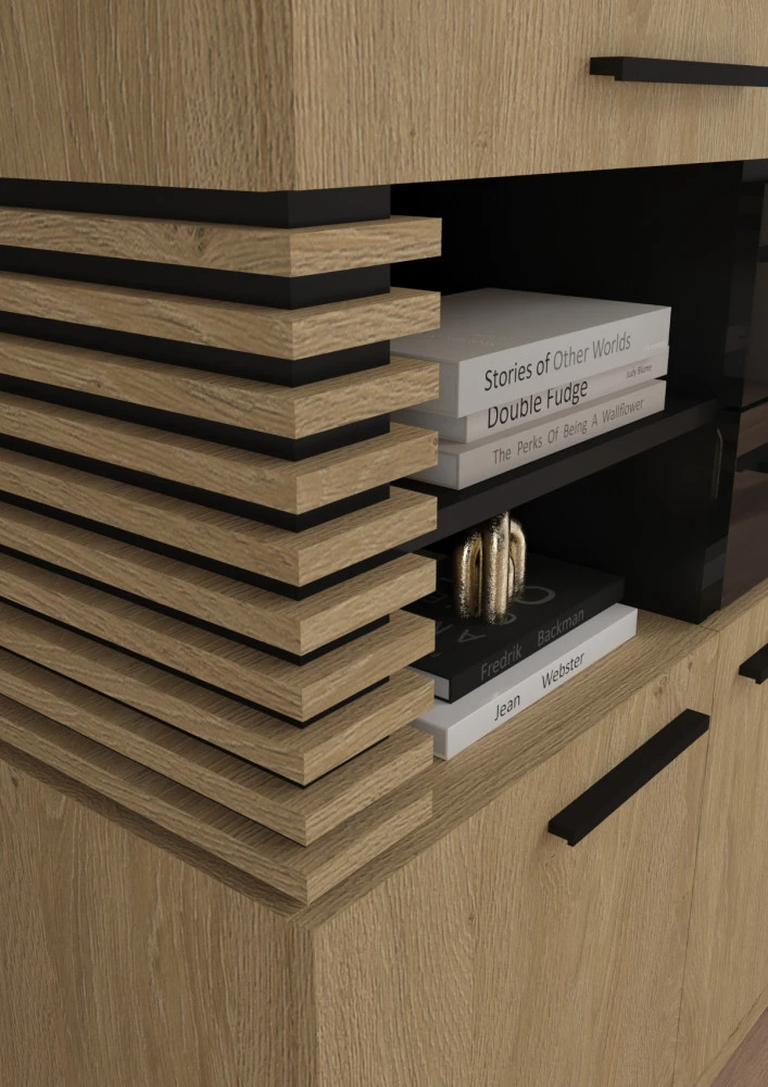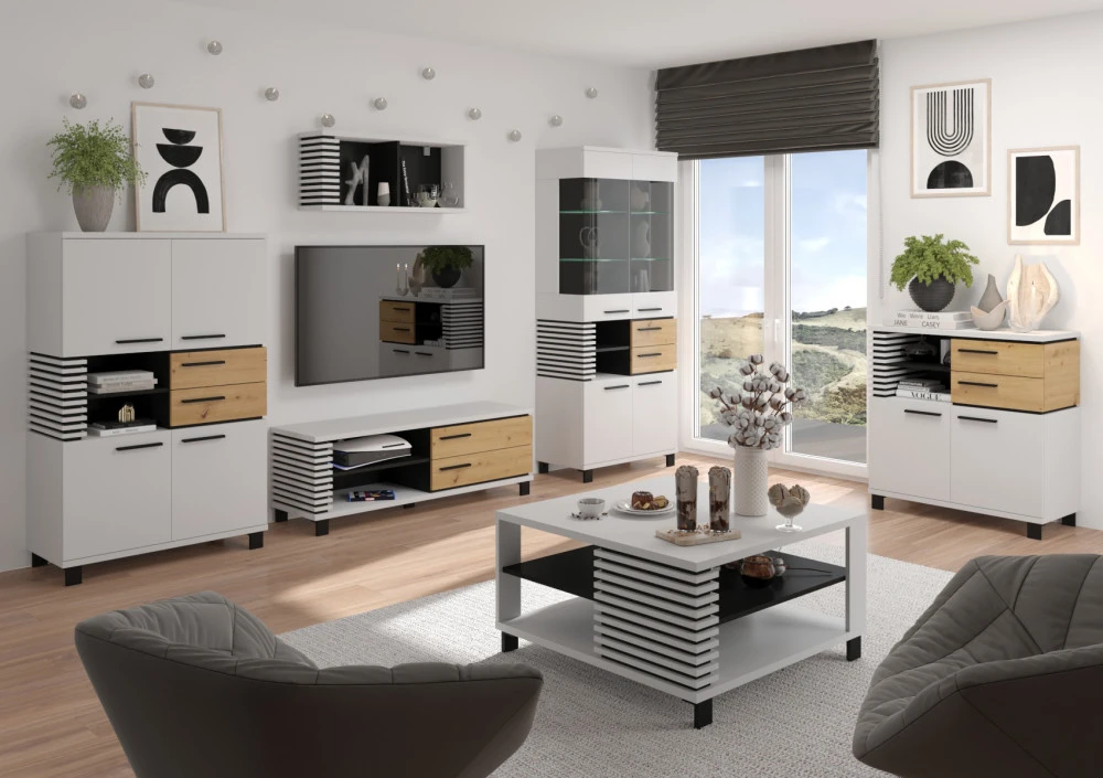 Konferenční stolek Lamir vás zaujme svým moderním elegantním designem s luxusními přírodními detaily. Je vyroben z kvalitních lamino desek o síle 16 mm a 25 mm. Desky mají ABS hranění, které zvyšuje odolnost pro odštípnutí hran. Součástí zásuvek a dvířek jsou jednoduché kovové úchyty a zároveň mají zabudovaný systém tichého dovírání. Nábytek stojí na 8 cm nožkách, které provzdušní váš interiér. Nabízíme vám několik barevných variant.Součástí stolku je otevřená nika pod horní deskou k uložení časopisů, knih, dálkového ovládání či jiných nezbytností.Doporučujeme si vybrat z dalších komodit systému Lamir, ze kterých si vytvoříte svůj vysněný obývací pokoj, relaxační místnost či pracovnu.Nábytek dodáváme v demontu.