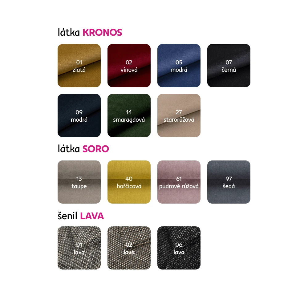 Možnost objednání v látce Soro, Savana, Kronos: 3.590 Kč v látce mikrofáze: 3.390 Kč v ekokůži nebo v látce Lava: 3.690 Kč. . Při individuální objednávce je třeba zaplatit 20% zálohu z dané částky. Po uhrazení zálohy bude Vaša objednávka zadána do výroby. Doba dodání 6-8 týdnů.