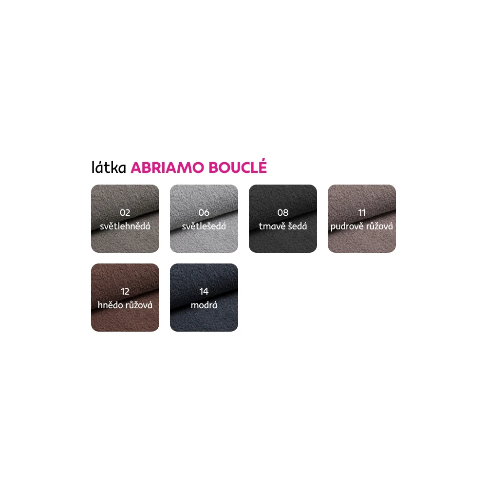 Možnost objednání v 6 barevných provedeních látky Abriamo Bouclé v ceně 5.450 Kč. Při individuální objednávce je třeba zaplatit 20% zálohu z dané částky. Po uhrazení zálohy bude Váš požadavek zadán do výroby. Doba dodání 6-8 týdnů.