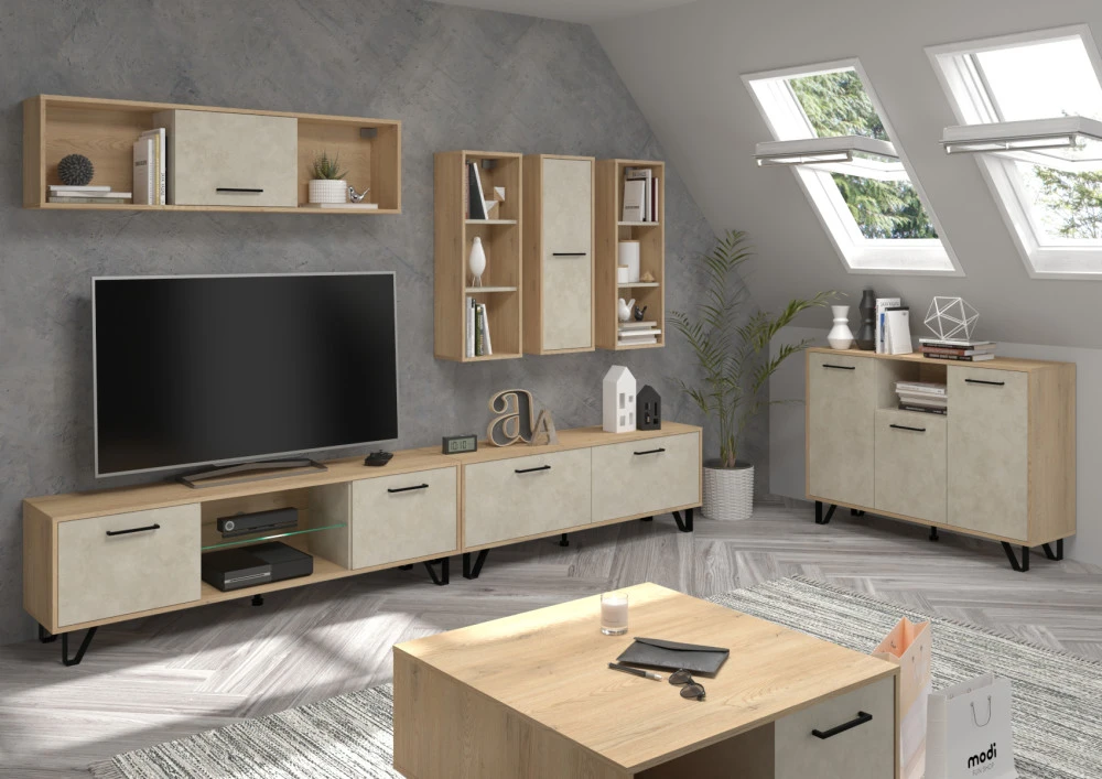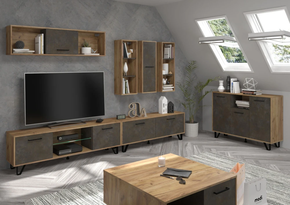 Obývací stěna Boss vás zaujme svým moderním elegantním designem a barevným provedením s přírodními detaily. Jednotlivé komodity jsou vyrobeny z kvalitních lamino desek o síle 16 mm. Desky mají ABS hranění, které zvyšuje odolnost pro odštípnutí hran. Součástí zásuvek a dvířek jsou jednoduché kovové úchyty a zároveň mají zabudovaný systém tichého dovírání. Nábytek stojí na kovových nožkách, které provzdušní váš interiér. Nabízíme vám několik barevných variant.Obývací stěna je sestavena z jednotlivých komodit systému Boss, ze kterých si vytvoříte svůj vysněný obývací pokoj, studentský pokoj, relaxační místnost či pracovnu.