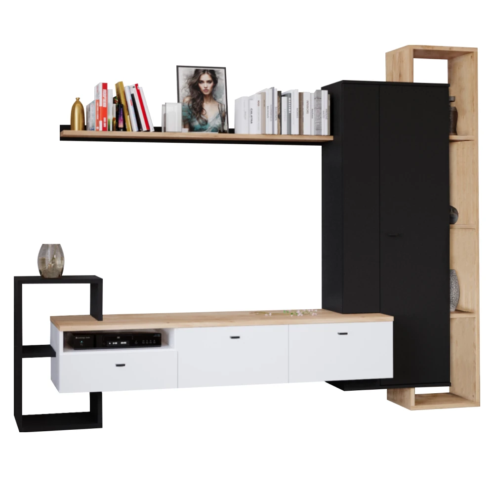Moderní obývací stěna s TV stolkem, skříňkou, policemi a regálem nabízí praktické a stylové řešení pro váš obývací pokoj. Atraktivní kombinace černé, bílé a dekoru dub craft zlatý dodává interiéru elegantní a současný vzhled, který zaujme na první pohled.