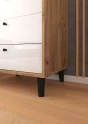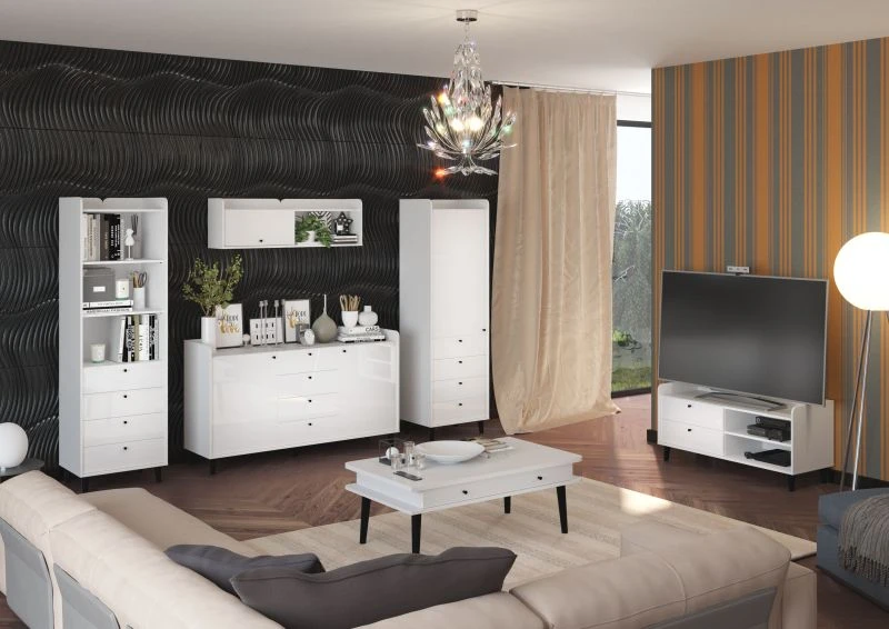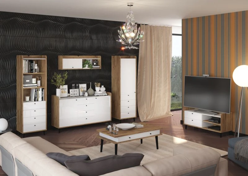 Hledáte funkční, trendový a nadčasový nábytek, který je propracovaný a snadno se udržuje? Systém Dolce uspokojí vaše nároky na design i funkčnost. Kolekce nábytku Dolce vyniká designem, vysokou funkčností a čistými liniemi. Lamino materiál o síle 16 mm a 25 mm doplňují ABS hrany, které chrání nábytek proti mechanickému poškození. Skříňky i zásuvky se systémem tichého dovírání zvýší komfort užívání.Výrazným prvkem jsou černé dřevěné nožky různých výšek, které dodají celé kolekci originální vzhled. A nejen to, vyšší nožky jsou také praktické při uklízení. Vitríny jsou vybavené kouřovými skly, které ještě více zdůrazní originální vzhled systému. Černou barvu mají i úchyty a spolu s bílým leskem na předních plochách skvěle doplňují dřevodekory reflektující moderní trendy v bydlení. S kolekcí Dolce nemůžete šlápnout vedle! Sestava se skládá ze skříňky Dolce 01, komody Dolce 06, regálu Dolce 16, TV stolku Dolce 18 a závěsné skříňky Dolce 24.