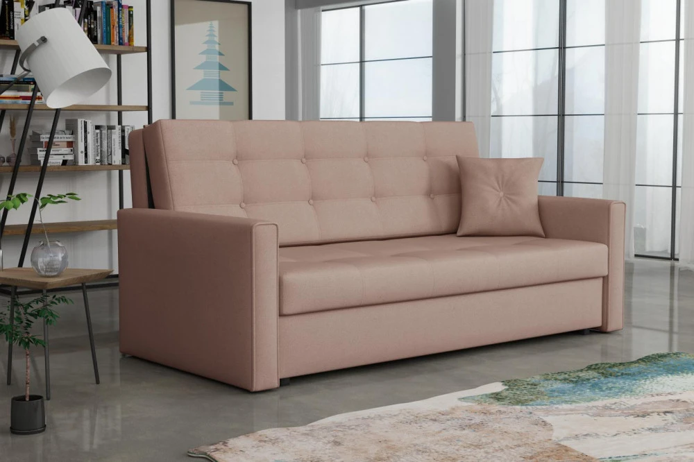 Rozkládací pohovka Vivian je díky svým rozměrům vhodná i do menších pokojů. Je vyrobena v jednoduchém a zároveň elegantním designu, který se hodí do všech interiérů. Můžete ji umístit do obývacího, dětského, studentského, nebo hostinského pokoje. Jednoduchým rozložením pomocí automatu, získáte lůžko k příležitostnému přespání Vaší návštěvy. Výplň sedáku tvoří vlnité pružiny v kombinaci s PUR pěnou. Pohovka je potažena kvalitní látkou a nabízíme ji v několika trendy odstínech. Pohovka disponuje i nepostradatelným úložným prostorem, který využijete např. na deku a polštář. V ceně pohovky je 1 dekorační polštář. Ostatní vyobrazené dekorace nejsou v ceně.