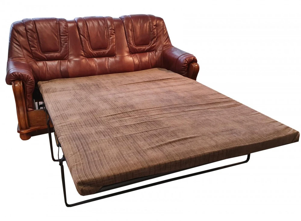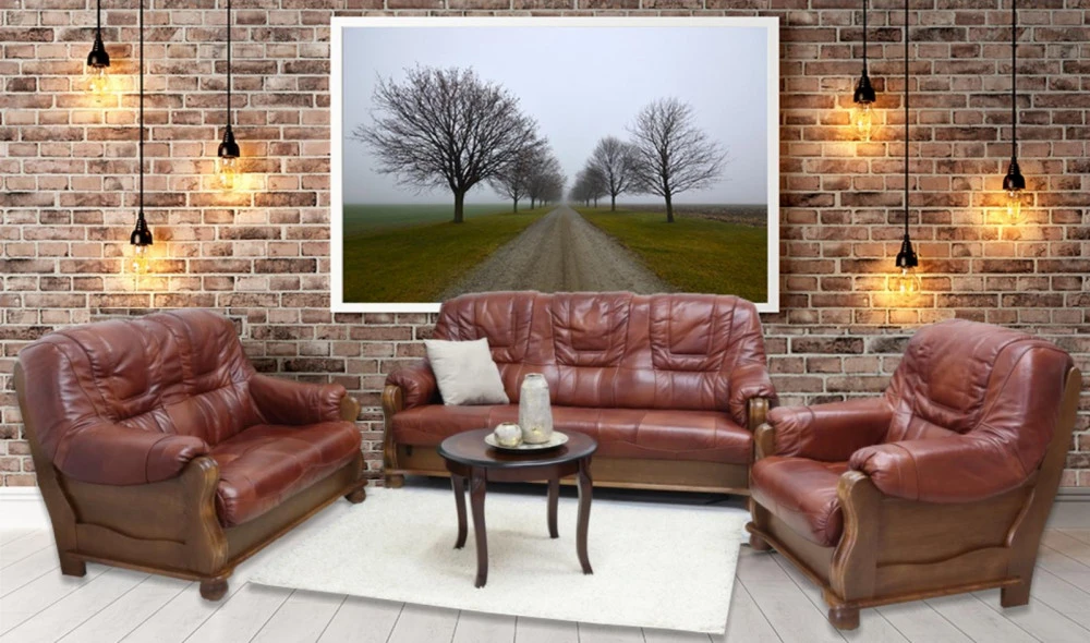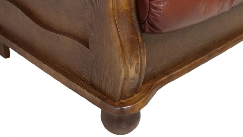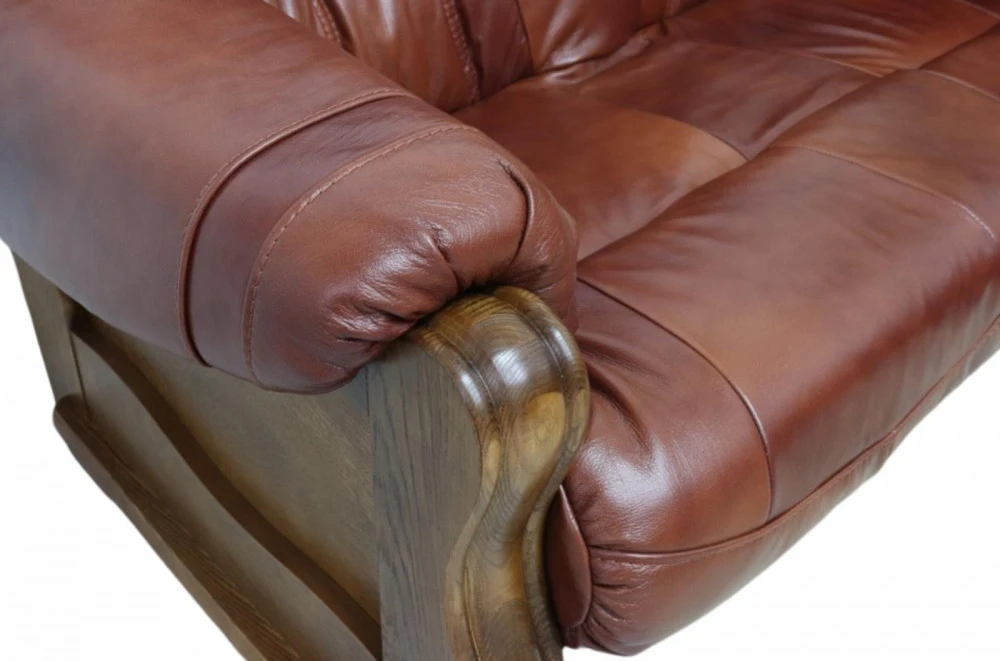 Čalounění z pravé přírodní kůže dodává sedačce jedinečný vzhled i příjemný dotek, zatímco masivní dubová konstrukce zaručuje dlouhou životnost a vysokou odolnost. Stylové dřevěné detaily a precizní šití podtrhují luxusní charakter celé kolekce.