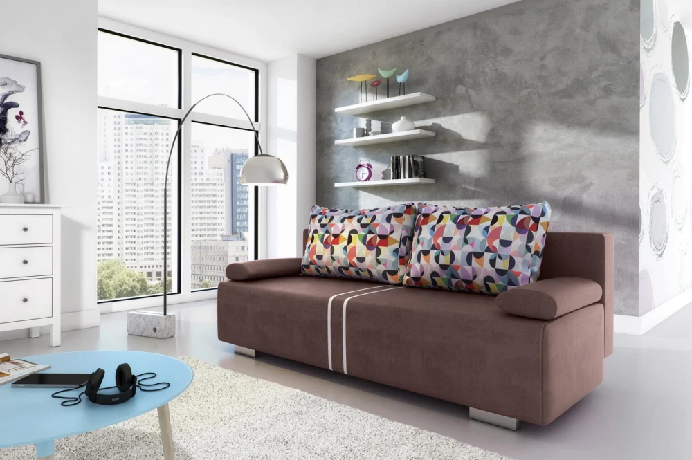 Moderní rozkládací pohovka s úložným prostorem. Výplň pohovky tvoří pružiny bonell v kombinaci s kvalitní PUR pěnou. Jednoduchým rozkladem pomocí automatu vznikne lůžko vhodné k příležitostnému spaní. Pohovku dodáváme v několika barevných provedeních, které také naleznete v naší nabídce.