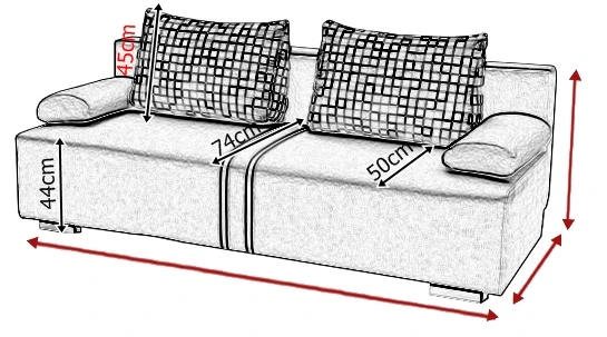 Rozpis rozměrů najdete na přiloženém obrázku s nákresem. V ceně pohovky jsou 2 velké barevné polštáře a dva menší polštáře v barvě pohovky, které slouží jako opěrky na ruce. Ostatní vyobrazené dekorace nejsou v ceně.